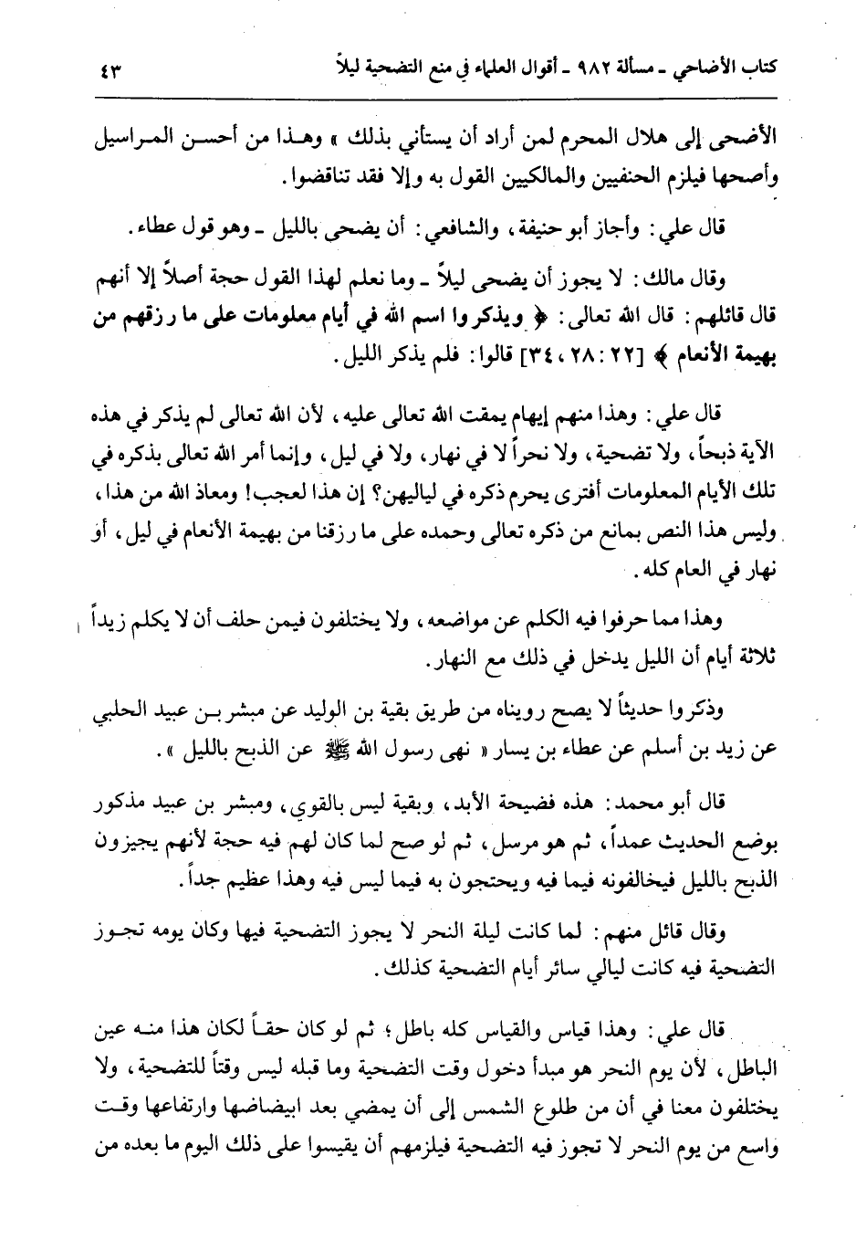 قَالَ عَلِيٌّ: وَهَذَا مِنْهُمْ إيهَامٌ يُمَقِّتُ اللَّهُ تَعَالَى عَلَيْهِ، لِأَنَّ اللَّهَ تَعَالَى لَمْ يَذْكُرْ فِي هَذِهِ الْآيَةِ ذَبْحًا، وَلَا تَضْحِيَةً، وَلَا نَحْرًا لَا فِي نَهَارٍ، وَلَا فِي لَيْلٍ، وَإِنَّمَا أَمَرَ اللَّهُ تَعَالَى بِذِكْرِهِ فِي تِلْكَ الْأَيَّامِ الْمَعْلُومَاتِ أَفَتَرَى يَحْرُمُ ذِكْرُهُ فِي لَيَالِيِهِنَّ؟ إنَّ هَذَا لَعَجَبٌ وَمَعَاذَ اللَّهِ مِنْ هَذَا، وَلَيْسَ هَذَا النَّصُّ بِمَانِعٍ مِنْ ذِكْرِهِ تَعَالَى وَحَمْدِهِ عَلَى مَا رَزَقَنَا مِنْ بَهِيمَةِ الْأَنْعَامِ فِي لَيْلٍ أَوْ نَهَارٍ فِي الْعَامِ كُلِّهِ.