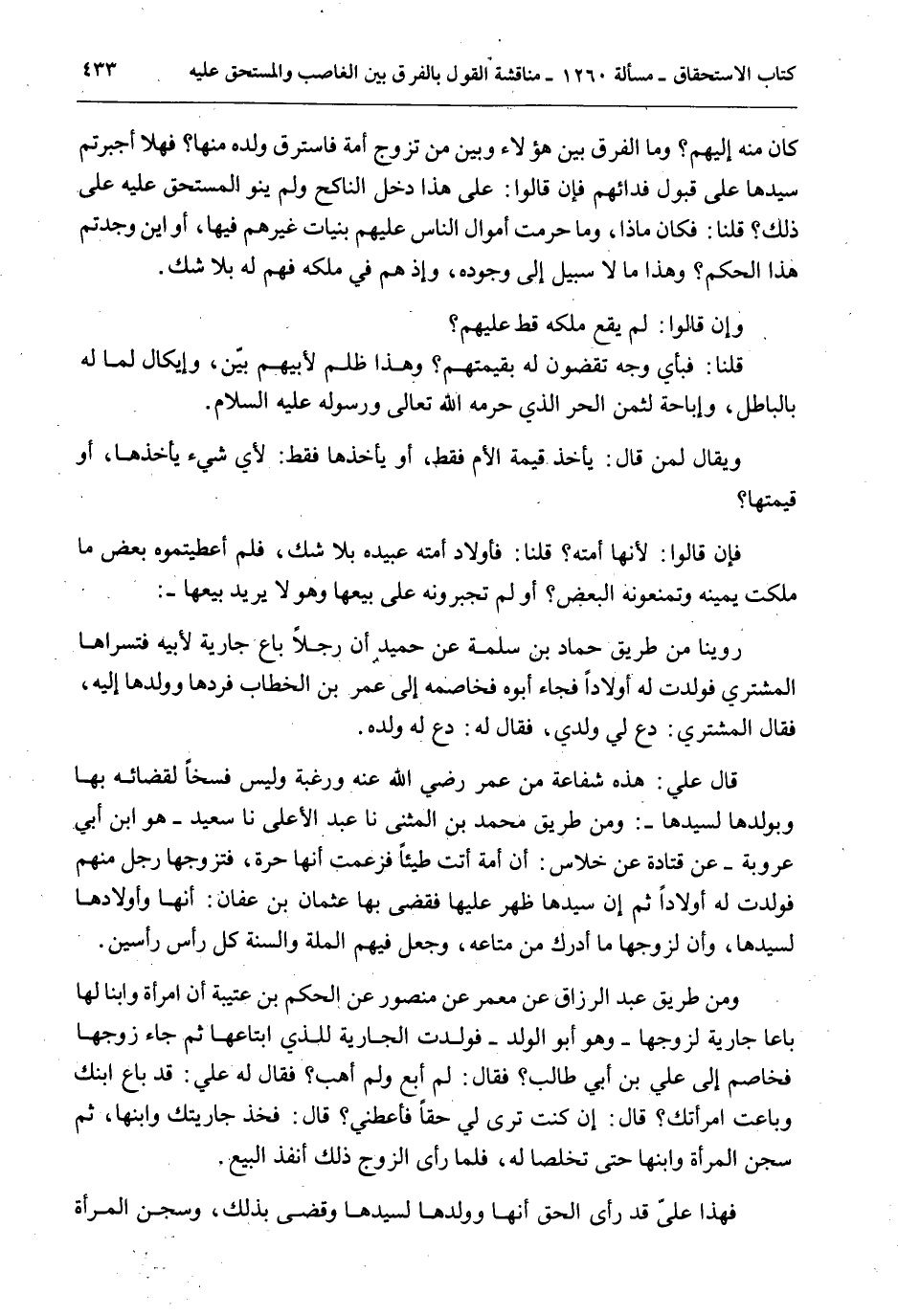 وَيُقَالُ لِمَنْ قَالَ: يَأْخُذُ قِيمَةَ الْأُمِّ فَقَطْ، أَوْ يَأْخُذُهَا فَقَطْ: لِأَيِّ شَيْءٍ يَأْخُذُهَا، أَوْ قِيمَتَهَا؟ فَإِنْ قَالُوا: لِأَنَّهَا أَمَتُهُ؟ قُلْنَا: فَأَوْلَادُ أَمَتِهِ عَبِيدُهُ بِلَا شَكٍّ، فَلِمَ أَعْطَيْتُمُوهُ بَعْضَ مَا مَلَكَتْ يَمِينُهُ وَتَمْنَعُونَهُ الْبَعْضَ؟ أَوْ لِمَ تَجْبُرُونَهُ عَلَى بَيْعِهَا وَهُوَ لَا يُرِيدُ بَيْعَهَا -: رُوِّينَا مِنْ طَرِيقِ حَمَّادِ بْنِ سَلَمَةَ عَنْ حُمَيْدٍ أَنَّ رَجُلًا بَاعَ جَارِيَةً لِأَبِيهِ فَتَسَرَّاهَا الْمُشْتَرِي فَوَلَدَتْ لَهُ أَوْلَادًا فَجَاءَ أَبُوهُ فَخَاصَمَهُ إلَى عُمَرَ بْنِ الْخَطَّابِ فَرَدَّهَا وَوَلَدَهَا إلَيْهِ، فَقَالَ الْمُشْتَرِي: دَعْ لِي وَلَدِي، فَقَالَ لَهُ: دَعْ لَهُ وَلَدَهُ. قَالَ عَلِيٌّ: هَذِهِ شَفَاعَةٌ مِنْ عُمَرَ - رَضِيَ اللَّهُ عَنْهُ - وَرَغْبَةٌ وَلَيْسَ فَسْخًا لِقَضَائِهِ بِهَا وَبِوَلَدِهَا لِسَيِّدِهَا -: وَمِنْ طَرِيقِ مُحَمَّدِ بْنِ الْمُثَنَّى نا عَبْدُ الْأَعْلَى نا سَعِيدٌ - هُوَ ابْنُ أَبِي عَرُوبَةَ - عَنْ قَتَادَةَ عَنْ خِلَاسٍ: أَنَّ أَمَةً أَتَتْ طَيِّئًا فَزَعَمَتْ أَنَّهَا حُرَّةٌ، فَتَزَوَّجَهَا رَجُلٌ مِنْهُمْ فَوَلَدَتْ لَهُ أَوْلَادًا ثُمَّ إنَّ سَيِّدَهَا ظَهَرَ عَلَيْهَا فَقَضَى بِهَا عُثْمَانُ بْنُ عَفَّانَ: أَنَّهَا وَأَوْلَادَهَا لِسَيِّدِهَا، وَأَنَّ لِزَوْجِهَا مَا أَدْرَكَ مِنْ مَتَاعِهِ، وَجَعَلَ فِيهِمْ الْمِلَّةَ وَالسُّنَّةَ كُلُّ رَأْسٍ رَأْسَيْنِ.