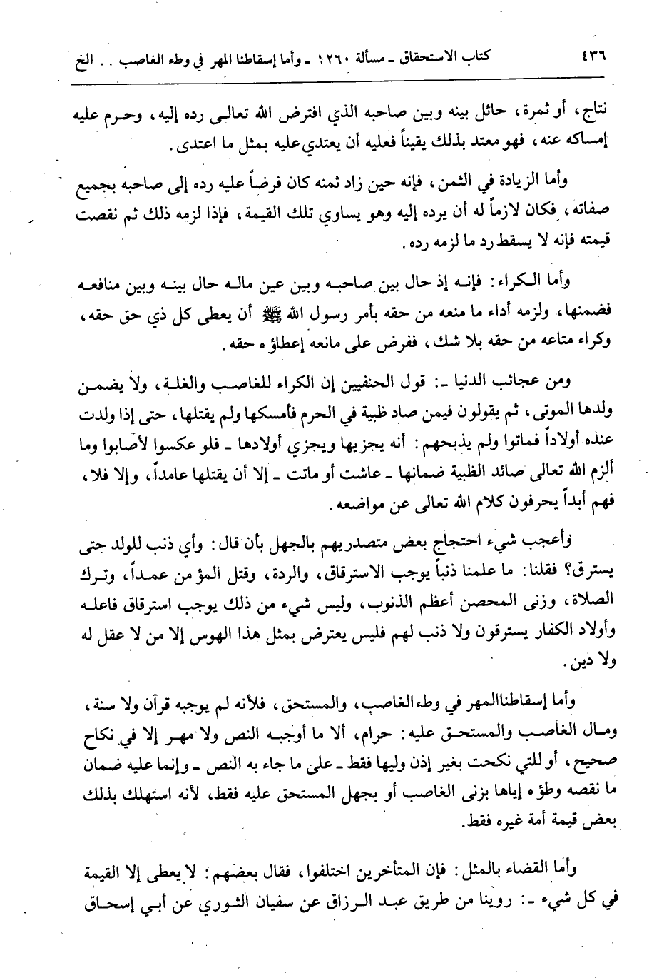 وَأَمَّا إسْقَاطُنَا الْمَهْرَ فِي وَطْءِ الْغَاصِبِ، وَالْمُسْتَحِقِّ، فَلِأَنَّهُ لَمْ يُوجِبْهُ قُرْآنٌ وَلَا سُنَّةٌ، وَمَالُ الْغَاصِبِ وَالْمُسْتَحَقِّ عَلَيْهِ: حَرَامٌ، إلَّا مَا أَوْجَبَهُ النَّصُّ وَلَا مَهْرَ إلَّا فِي نِكَاحٍ صَحِيحٍ، أَوْ لِلَّتِي نُكِحَتْ بِغَيْرِ إذْنِ وَلِيِّهَا فَقَطْ - عَلَى مَا جَاءَ بِهِ النَّصُّ - وَإِنَّمَا عَلَيْهِ ضَمَانُ مَا نَقَصَهُ وَطْؤُهُ إيَّاهَا بِزِنَى الْغَاصِبِ أَوْ بِجَهْلِ الْمُسْتَحَقِّ عَلَيْهِ فَقَطْ، لِأَنَّهُ اسْتَهْلَكَ بِذَلِكَ بَعْضَ قِيمَةِ أَمَةِ غَيْرِهِ فَقَطْ.