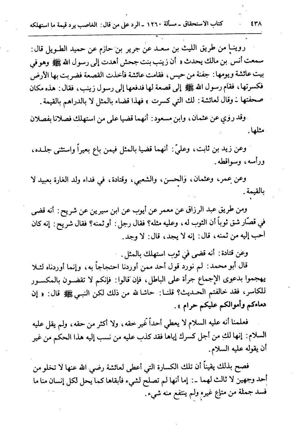 رُوِّينَا مِنْ طَرِيقِ اللَّيْثِ بْنِ سَعْدٍ عَنْ جَرِيرِ بْنِ حَازِمٍ عَنْ حُمَيْدٍ الطَّوِيلِ قَالَ: سَمِعْت أَنَسَ بْنَ مَالِكٍ يُحَدِّثُ «أَنَّ زَيْنَبَ بِنْتَ جَحْشٍ أَهْدَتْ إلَى رَسُولِ اللَّهِ - صَلَّى اللَّهُ عَلَيْهِ وَسَلَّمَ - وَهُوَ فِي بَيْتِ عَائِشَةَ وَيَوْمِهَا: جَفْنَةً مِنْ حَيْسٍ، فَقَامَتْ عَائِشَةُ فَأَخَذَتْ الْقَصْعَةَ فَضَرَبَتْ بِهَا الْأَرْضَ فَكَسَرَتْهَا، فَقَامَ رَسُولُ اللَّهِ - صَلَّى اللَّهُ عَلَيْهِ وَسَلَّمَ - إلَى قَصْعَةٍ لَهَا فَدَفَعَهَا إلَى رَسُولِ زَيْنَبَ، فَقَالَ: هَذِهِ مَكَانُ صَحْفَتِهَا - وَقَالَ لِعَائِشَةَ: لَكِ الَّتِي كَسَرْتِ» فَهَذَا قَضَاءٌ بِالْمِثْلِ لَا بِالدَّرَاهِمِ بِالْقِيمَةِ.