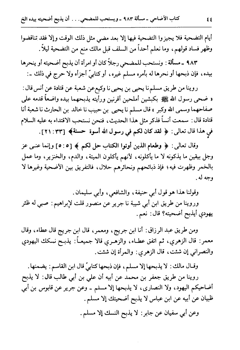 983 - مَسْأَلَةٌ: وَنَسْتَحِبُّ لِلْمُضَحِّي رَجُلًا كَانَ أَوْ امْرَأَةً أَنْ يَذْبَحَ أُضْحِيَّتَهُ أَوْ يَنْحَرَهَا بِيَدِهِ، فَإِنْ ذَبَحَهَا أَوْ نَحَرَهَا لَهُ بِأَمْرِهِ مُسْلِمٌ غَيْرُهُ أَوْ كِتَابِيٌّ أَجْزَأَهُ وَلَا حَرَجَ فِي ذَلِكَ -: رُوِّينَا مِنْ طَرِيقِ مُسْلِمٍ نَا يَحْيَى بْنُ يَحْيَى نَا وَكِيعٌ عَنْ شُعْبَةَ عَنْ قَتَادَةَ عَنْ أَنَسٍ قَالَ: «ضَحَّى رَسُولُ اللَّهِ - صَلَّى اللَّهُ عَلَيْهِ وَسَلَّمَ - بِكَبْشَيْنِ أَمْلَحَيْنِ أَقَرْنَيْنِ وَرَأَيْتُهُ يَذْبَحُهُمَا بِيَدِهِ وَاضِعًا قَدَمَهُ عَلَى صِفَاحِهِمَا وَسَمَّى اللَّهَ وَكَبَّرَ» قَالَ مُسْلِمٌ نَا يَحْيَى بْنُ حَبِيبٍ نَا خَالِدُ بْنُ الْحَارِثِ نَا شُعْبَةُ أَنَا قَتَادَةُ قَالَ: سَمِعْت أَنَسًا فَذَكَرَ مِثْلَ هَذَا الْحَدِيثِ، فَنَحْنُ نَسْتَحِبُّ الِاقْتِدَاءَ بِهِ - عَلَيْهِ السَّلَامُ - فِي هَذَا قَالَ تَعَالَى: {لَقَدْ كَانَ لَكُمْ فِي رَسُولِ اللَّهِ أُسْوَةٌ حَسَنَةٌ} [الأحزاب: 21] .