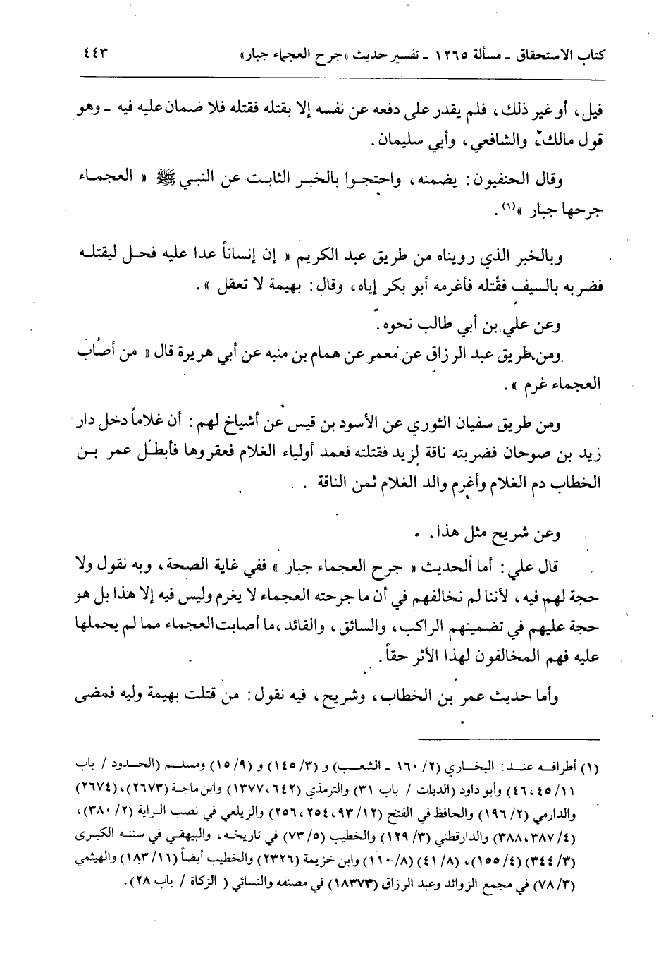 قَالَ عَلِيٌّ: أَمَّا الْحَدِيثُ «جَرْحُ الْعَجْمَاءِ جُبَارٌ» فَفِي غَايَةِ الصِّحَّةِ، وَبِهِ نَقُولُ وَلَا حُجَّةَ لَهُمْ فِيهِ، لِأَنَّنَا لَمْ نُخَالِفْهُمْ فِي أَنَّ مَا جَرَحَتْهُ الْعَجْمَاءُ لَا يَغْرَمُ وَلَيْسَ فِيهِ إلَّا هَذَا بَلْ هُوَ حُجَّةٌ عَلَيْهِمْ فِي تَضْمِينِهِمْ الرَّاكِبَ، وَالسَّائِقَ، وَالْقَائِدَ، مَا أَصَابَ الْعَجْمَاءُ مِمَّا لَمْ يَحْمِلْهَا عَلَيْهِ فَهُمْ الْمُخَالِفُونَ لِهَذَا الْأَثَرِ.