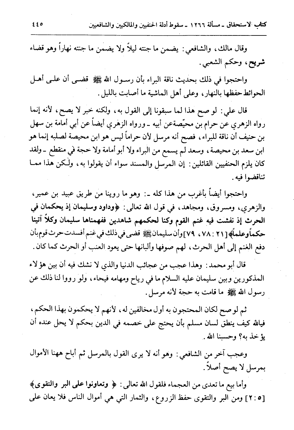 وَاحْتَجُّوا أَيْضًا بِأَغْرَبَ مِنْ هَذَا كُلِّهِ -: وَهُوَ مَا رُوِّينَا مِنْ طَرِيقِ عُبَيْدِ بْنِ عُمَيْرٍ، وَالزُّهْرِيِّ، وَمَسْرُوقٍ، وَمُجَاهِدٍ، فِي قَوْلِ اللَّهِ تَعَالَى: {وَدَاوُدَ وَسُلَيْمَانَ إِذْ يَحْكُمَانِ فِي الْحَرْثِ إِذْ نَفَشَتْ فِيهِ غَنَمُ الْقَوْمِ وَكُنَّا لِحُكْمِهِمْ شَاهِدِينَ} [الأنبياء: 78] {فَفَهَّمْنَاهَا سُلَيْمَانَ وَكُلا آتَيْنَا حُكْمًا وَعِلْمًا} [الأنبياء: 79] وَأَنَّ سُلَيْمَانَ - صَلَّى اللَّهُ عَلَيْهِ وَسَلَّمَ - قَضَى فِي ذَلِكَ فِي غَنَمٍ أَفْسَدَتْ حَرْثَ قَوْمٍ بِأَنْ دَفَعَ الْغَنَمَ إلَى أَهْلِ الْحَرْثِ، لَهُمْ صُوفُهَا وَأَلْبَانُهَا حَتَّى يَعُودَ الْعِنَبُ أَوْ الْحَرْثُ كَمَا كَانَ.