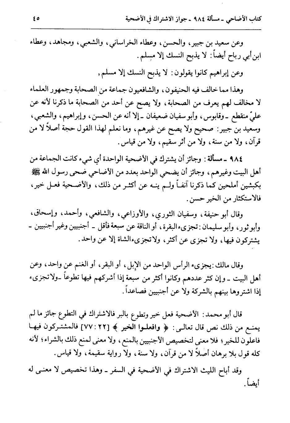 984 - مَسْأَلَةٌ: وَجَائِزٌ أَنْ يَشْتَرِكَ فِي الْأُضْحِيَّةِ الْوَاحِدَةِ أَيُّ شَيْءٍ كَانَتْ الْجَمَاعَةُ مِنْ أَهْلِ الْبَيْتِ وَغَيْرِهِمْ، وَجَائِزٌ أَنْ يُضَحِّيَ الْوَاحِدُ بِعَدَدٍ مِنْ الْأَضَاحِيِّ «ضَحَّى رَسُولُ اللَّهِ - صَلَّى اللَّهُ عَلَيْهِ وَسَلَّمَ - بِكَبْشَيْنِ أَمْلَحَيْنِ» كَمَا ذَكَرْنَا آنِفًا وَلَمْ يَنْهَ عَنْ أَكْثَرَ مِنْ ذَلِكَ، وَالْأُضْحِيَّةُ فِعْلُ خَيْرٍ، فَالِاسْتِكْثَارُ مِنْ الْخَيْرِ حَسَنٌ.
