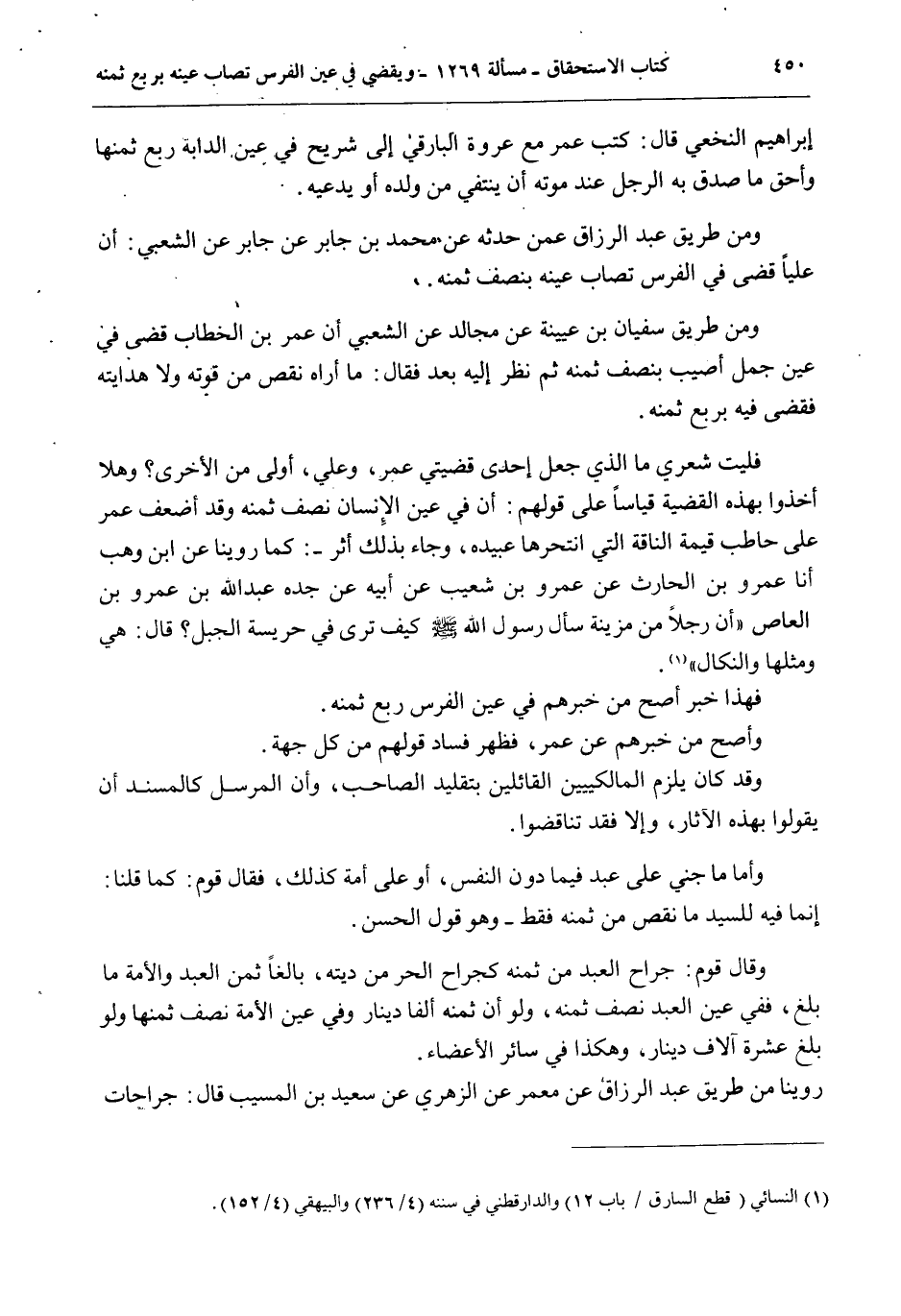 إبْرَاهِيمَ النَّخَعِيِّ قَالَ: كَتَبَ عُمَرُ مَعَ عُرْوَةَ الْبَارِقِيِّ إلَى شُرَيْحٍ فِي عَيْنِ الدَّابَّةِ رُبْعُ ثَمَنِهَا وَأَحَقُّ مَا صَدَقَ بِهِ الرَّجُلُ عِنْدَ مَوْتِهِ أَنْ يَنْتَفِيَ مِنْ وَلَدِهِ أَوْ يَدَّعِيَهُ.