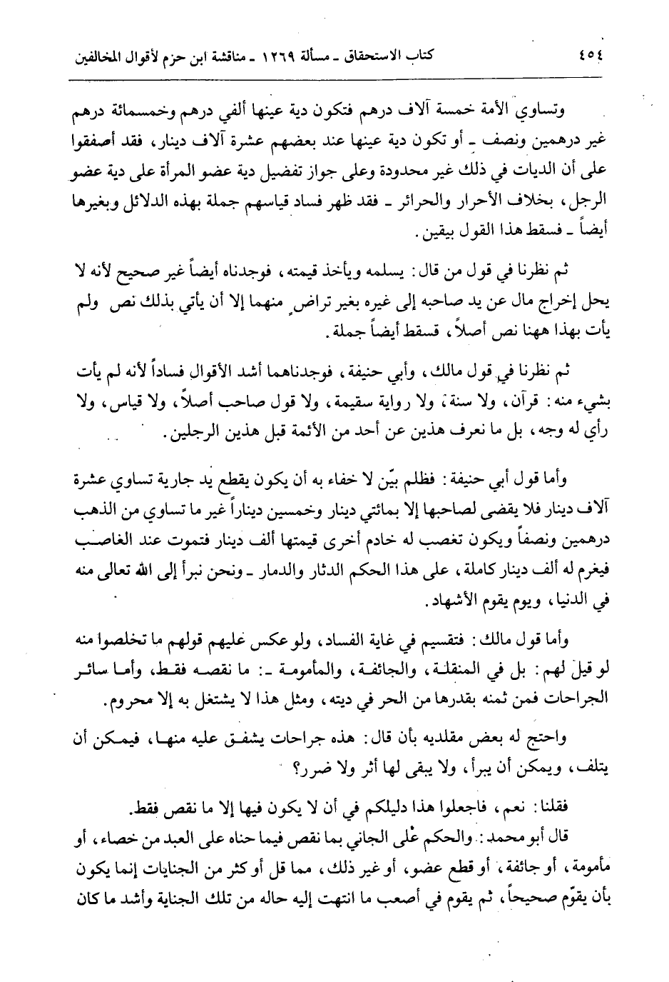 وَتُسَاوِي الْأَمَةُ خَمْسَةَ آلَافِ دِرْهَمٍ فَتَكُونُ دِيَةُ عَيْنِهَا أَلْفَيْ دِرْهَمٍ وَخَمْسَمِائَةِ دِرْهَمٍ غَيْرَ دِرْهَمَيْنِ وَنِصْفٍ - أَوْ تَكُونُ دِيَةُ عَيْنِهَا عِنْدَ بَعْضِهِمْ عَشَرَةَ آلَافِ دِينَارٍ، فَقَدْ أَصْفَقُوا عَلَى أَنَّ الدِّيَاتِ فِي ذَلِكَ غَيْرُ مَحْدُودَةٍ وَعَلَى جَوَازِ تَفْضِيلِ دِيَةِ عُضْوِ الْمَرْأَةِ عَلَى دِيَةِ عُضْوِ الرَّجُلِ، بِخِلَافِ الْأَحْرَارِ وَالْحَرَائِرِ - فَقَدْ ظَهَرَ فَسَادُ قِيَاسِهِمْ جُمْلَةً بِهَذِهِ الدَّلَائِلِ وَبِغَيْرِهَا أَيْضًا - فَسَقَطَ هَذَا الْقَوْلُ بِيَقِينِ.