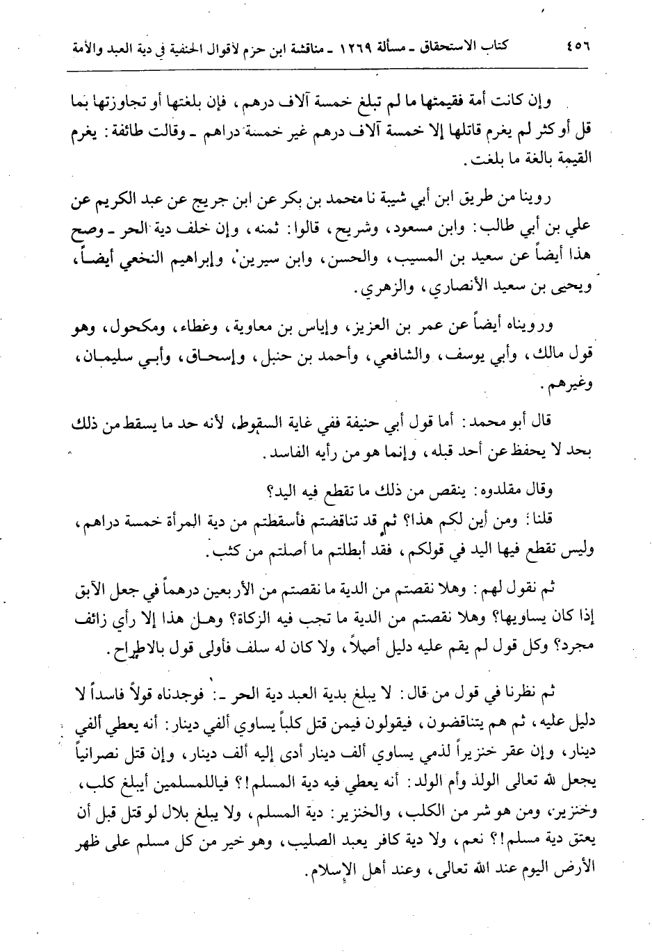 ثُمَّ نَظَرْنَا فِي قَوْلِ مَنْ قَالَ: لَا يَبْلُغُ بِدِيَةِ الْعَبْدِ دِيَةَ الْحُرِّ -: فَوَجَدْنَاهُ قَوْلًا فَاسِدًا لَا دَلِيلَ عَلَيْهِ، ثُمَّ هُمْ يَتَنَاقَضُونَ، فَيَقُولُونَ: فِيمَنْ قَتَلَ كَلْبًا يُسَاوِي أَلْفَيْ دِينَارٍ: أَنَّهُ يُعْطِي أَلْفَيْ دِينَارٍ، وَإِنْ عَقَرَ خِنْزِيرًا لِذِمِّيٍّ يُسَاوِي أَلْفَ دِينَارٍ أَدَّى إلَيْهِ أَلْفَ دِينَارٍ، وَإِنْ قَتَلَ نَصْرَانِيًّا يَجْعَلُ لِلَّهِ تَعَالَى الْوَلَدَ وَأُمَّ الْوَلَدِ: أَنَّهُ يُعْطِي فِيهِ دِيَةَ الْمُسْلِمِ؟ فَيَا لِلْمُسْلِمِينَ أَيَبْلُغُ كَلْبٌ، وَخِنْزِيرٌ، وَمَنْ هُوَ شَرٌّ مِنْ الْكَلْبِ، وَالْخِنْزِيرِ: دِيَةَ الْمُسْلِمِ، وَلَا يَبْلُغُ بِلَالٌ لَوْ قُتِلَ قَبْلَ أَنْ يُعْتَقَ دِيَةَ مُسْلِمٍ؟ نَعَمْ، وَلَا دِيَةَ كَافِرٍ يَعْبُدُ الصَّلِيبَ، وَهُوَ خَيْرٌ مِنْ كُلِّ مُسْلِمٍ عَلَى ظَهْرِ الْأَرْضِ الْيَوْمَ عِنْدَ اللَّهِ تَعَالَى، وَعِنْدَ أَهْلِ الْإِسْلَامِ.
