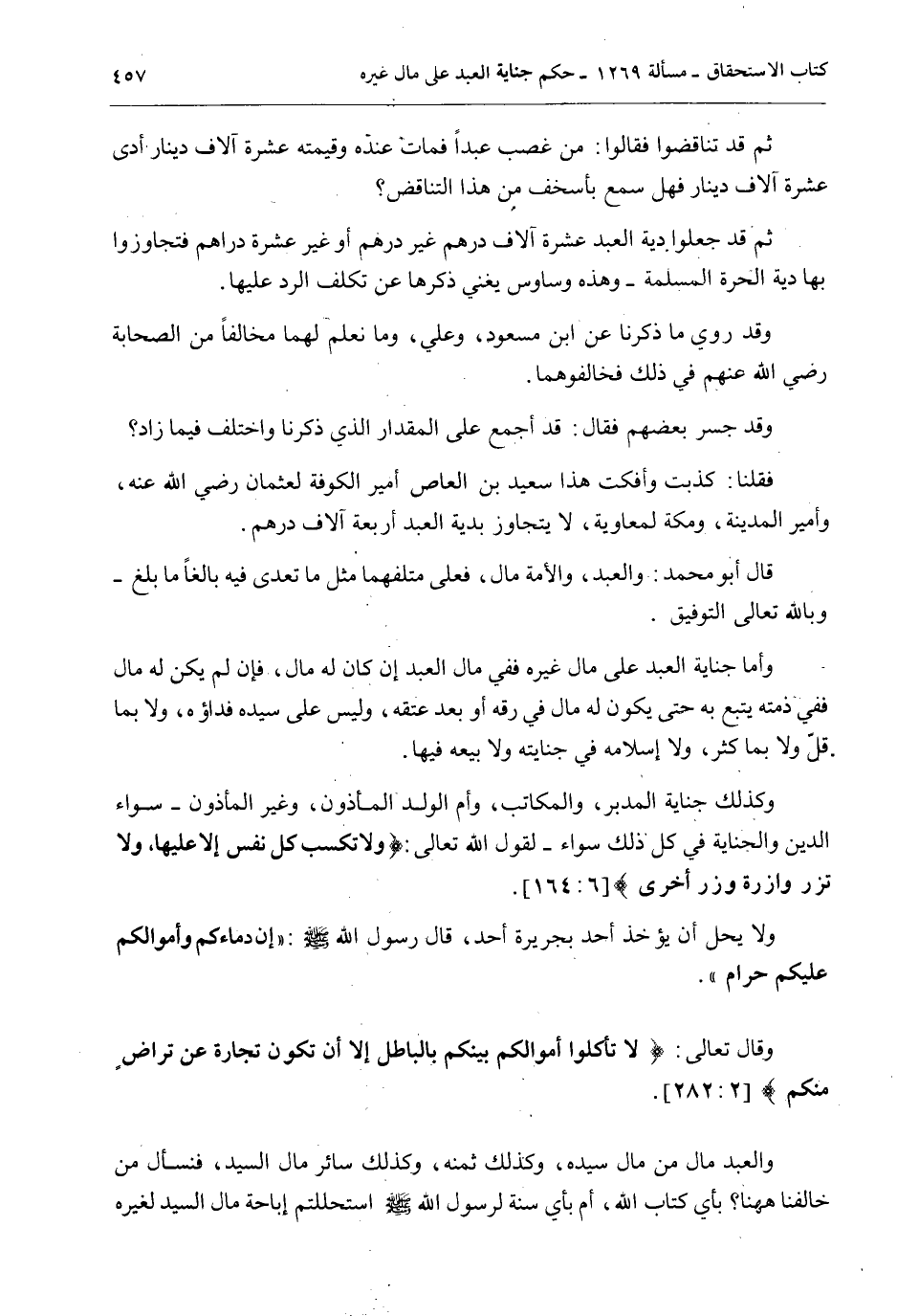 وَالْعَبْدُ مَالٌ مِنْ مَالِ سَيِّدِهِ، وَكَذَلِكَ ثَمَنُهُ، وَكَذَلِكَ سَائِرُ مَالِ السَّيِّدِ، فَنَسْأَلُ مَنْ خَالَفَنَا هَاهُنَا؟ بِأَيِّ كِتَابِ اللَّهِ، أَمْ بِأَيِّ سَنَةٍ لِرَسُولِ اللَّهِ - صَلَّى اللَّهُ عَلَيْهِ وَسَلَّمَ - اسْتَحْلَلْتُمْ إبَاحَةَ مَالِ السَّيِّدِ لِغَيْرِهِ