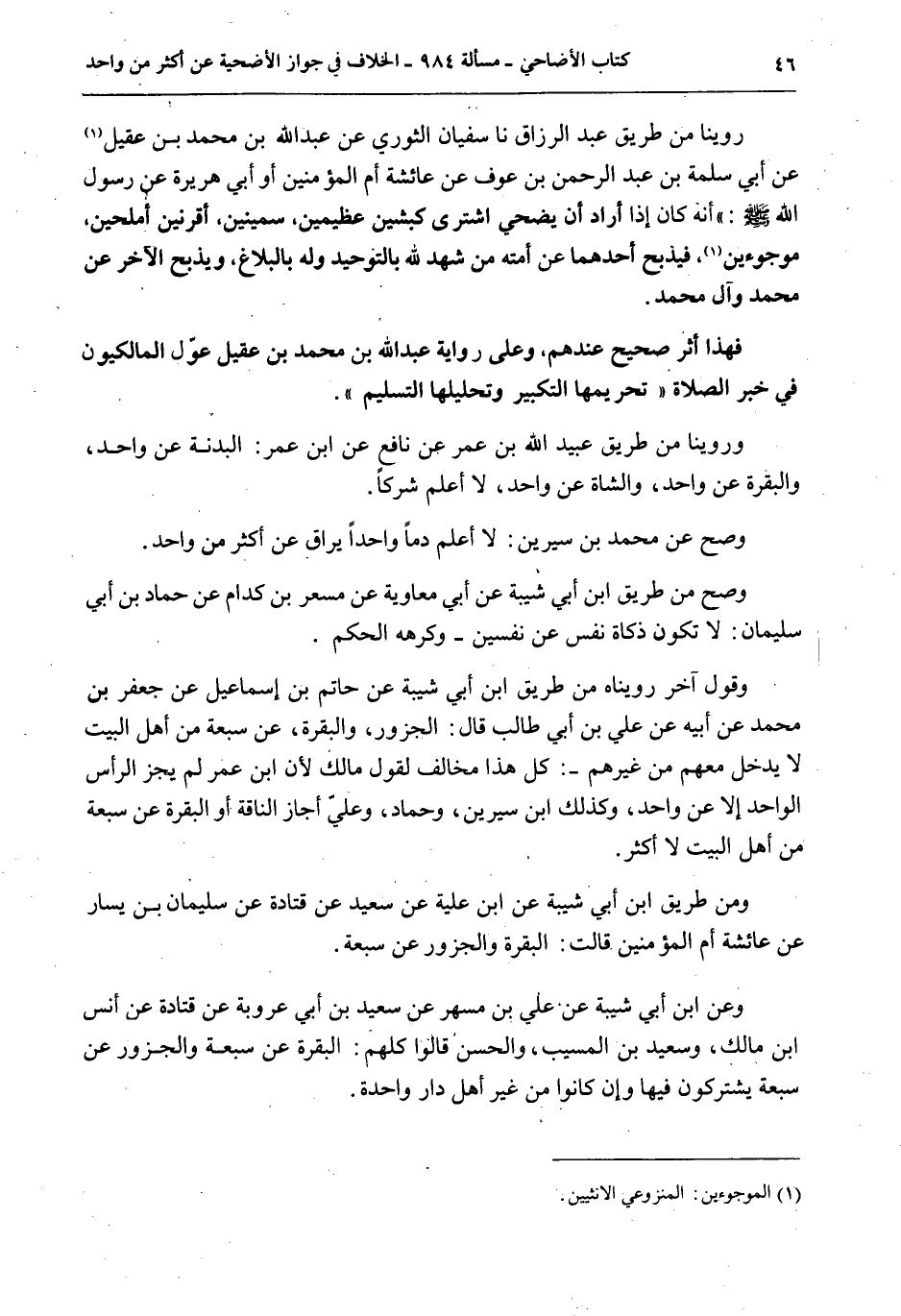 رُوِّينَا مِنْ طَرِيقِ عَبْدِ الرَّزَّاقِ نَا سُفْيَانُ الثَّوْرِيُّ عَنْ عَبْدِ اللَّهِ بْنِ مُحَمَّدِ بْنِ عَقِيلٍ عَنْ أَبِي سَلَمَةَ بْنِ عَبْدِ الرَّحْمَنِ بْنِ عَوْفٍ عَنْ عَائِشَةَ أُمِّ الْمُؤْمِنِينَ أَوْ أَبِي هُرَيْرَةَ «عَنْ رَسُولِ اللَّهِ - صَلَّى اللَّهُ عَلَيْهِ وَسَلَّمَ -: أَنَّهُ كَانَ إذَا أَرَادَ أَنْ يُضَحِّيَ اشْتَرَى كَبْشَيْنِ عَظِيمَيْنِ، سَمِينَيْنِ، أَقَرْنَيْنِ أَمْلَحَيْنِ، مَوْجُوءَيْنِ، فَيَذْبَحُ أَحَدَهُمَا عَنْ أُمَّتِهِ مَنْ شَهِدَ لِلَّهِ بِالتَّوْحِيدِ وَلَهُ بِالْبَلَاغِ، وَيَذْبَحُ الْآخَرَ عَنْ مُحَمَّدٍ وَآلِ مُحَمَّدٍ» .