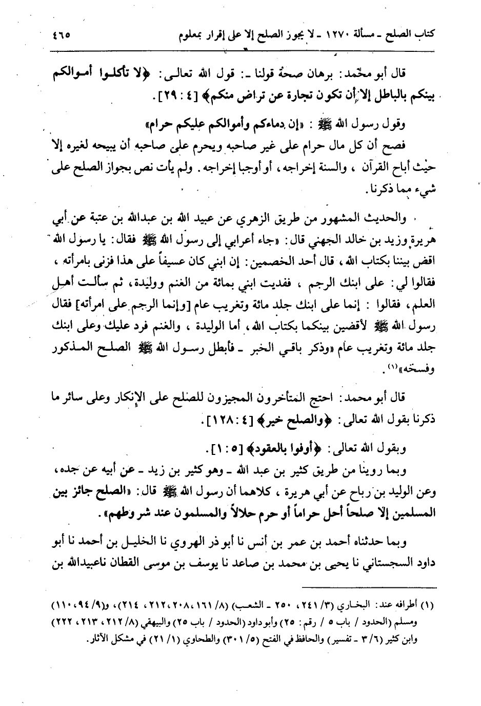 قَالَ أَبُو مُحَمَّدٍ: احْتَجَّ الْمُتَأَخِّرُونَ الْمُجِيزُونَ لِلصُّلْحِ عَلَى الْإِنْكَارِ وَعَلَى سَائِرِ مَا ذَكَرْنَا بِقَوْلِ اللَّهِ تَعَالَى: {وَالصُّلْحُ خَيْرٌ} [النساء: 128] . وَبِقَوْلِ اللَّهِ تَعَالَى: {أَوْفُوا بِالْعُقُودِ} [المائدة: 1] .