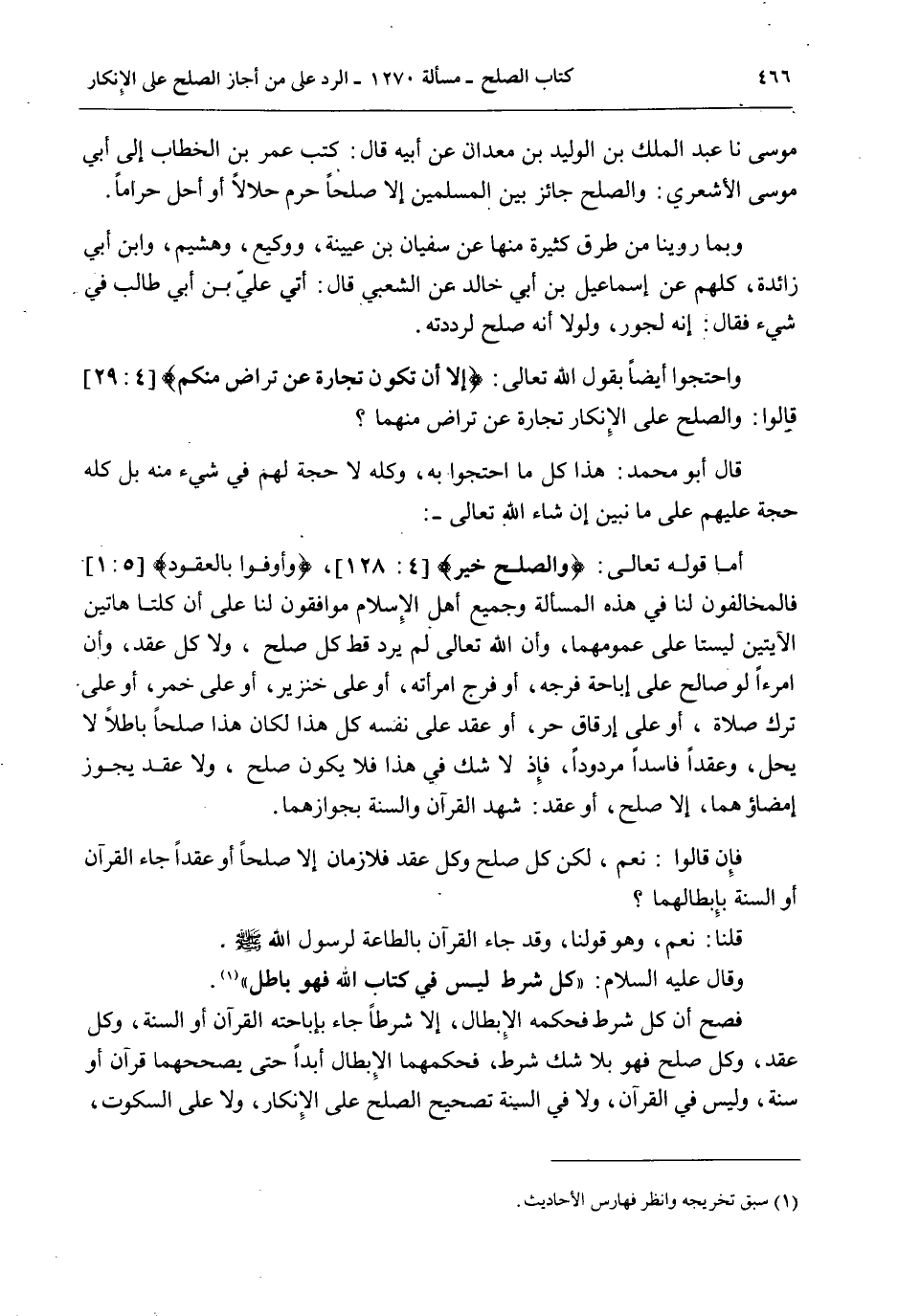 فَصَحَّ أَنَّ كُلَّ شَرْطٍ فَحُكْمُهُ الْإِبْطَالُ، إلَّا شَرْطًا جَاءَ بِإِبَاحَتِهِ الْقُرْآنُ أَوْ السُّنَّةُ، وَكُلُّ عَقْدٍ، وَكُلُّ صُلْحٍ فَهُوَ بِلَا شَكٍّ شَرْطٌ، فَحُكْمُهُمَا الْإِبْطَالُ أَبَدًا حَتَّى يُصَحِّحَهُمَا قُرْآنٌ أَوْ سُنَّةٌ، وَلَيْسَ فِي الْقُرْآنِ، وَلَا فِي السُّنَّةِ تَصْحِيحُ الصُّلْحِ عَلَى الْإِنْكَارِ، وَلَا عَلَى السُّكُوتِ،