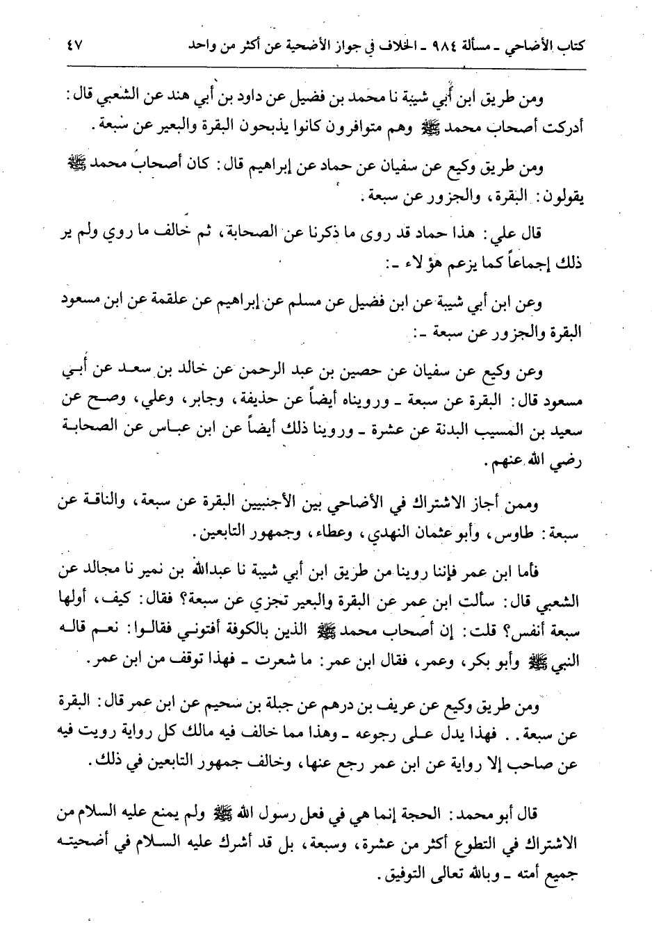 وَمِنْ طَرِيقِ ابْنِ أَبِي شَيْبَةَ نَا مُحَمَّدُ بْنُ فُضَيْلٍ عَنْ دَاوُد بْنِ أَبِي هِنْدٍ عَنْ الشَّعْبِيِّ قَالَ: أَدْرَكْت أَصْحَابَ مُحَمَّدٍ - صَلَّى اللَّهُ عَلَيْهِ وَسَلَّمَ - وَهُمْ مُتَوَافِرُونَ كَانُوا يَذْبَحُونَ الْبَقَرَةَ وَالْبَعِيرَ عَنْ سَبْعَةٍ.