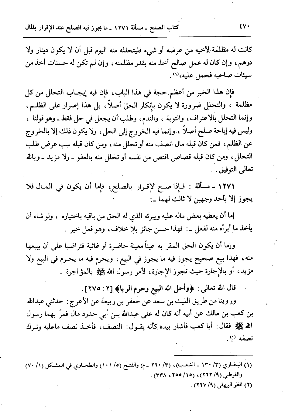فَإِنْ هَذَا الْخَبَرَ مِنْ أَعْظَمِ حُجَّةٍ فِي هَذَا الْبَابِ، فَإِنَّ فِيهِ إيجَابَ التَّحَلُّلِ مِنْ كُلِّ مَظْلَمَةٌ، وَالتَّحَلُّلُ ضَرُورَةً لَا يَكُونُ بِإِنْكَارِ الْحَقِّ أَصْلًا، بَلْ هَذَا إصْرَارٌ عَلَى الظُّلْمِ، وَإِنَّمَا التَّحَلُّلُ بِالِاعْتِرَافِ، وَالتَّوْبَةِ، وَالنَّدَمِ، وَطَلَبِ أَنْ يُجْعَلَ فِي حِلٍّ فَقَطْ - وَهُوَ قَوْلُنَا، وَلَيْسَ فِيهِ إبَاحَةُ صُلْحٍ أَصْلًا، وَإِنَّمَا فِيهِ الْخُرُوجُ إلَى الْحِلِّ، وَلَا يَكُونُ ذَلِكَ إلَّا بِالْخُرُوجِ عَنْ الظُّلْمِ، فَمَنْ كَانَ قِبَلَهُ مَالٌ أُنْصِفَ مِنْهُ أَوْ تَحَلَّلَ مِنْهُ، وَمَنْ كَانَ قِبَلَهُ سَبُّ عِرْضٍ طَلَبَ التَّحَلُّلَ، وَمَنْ كَانَ قِبَلَهُ قِصَاصٌ اقْتَصَّ مِنْ نَفْسِهِ أَوْ تَحَلَّلَ مِنْهُ بِالْعَفْوِ - وَلَا مَزِيدَ - وَبِاَللَّهِ تَعَالَى التَّوْفِيقُ.