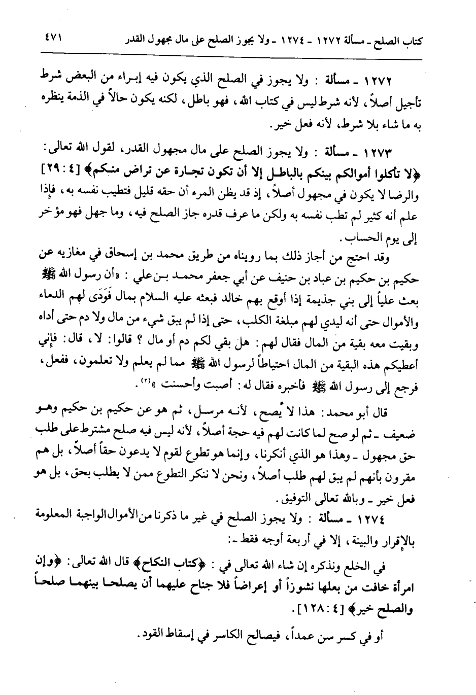 1273 - مَسْأَلَةٌ: وَلَا يَجُوزُ الصُّلْحُ عَلَى مَالٍ مَجْهُولِ الْقَدْرِ، لِقَوْلِ اللَّهِ تَعَالَى: {لا تَأْكُلُوا أَمْوَالَكُمْ بَيْنَكُمْ بِالْبَاطِلِ إِلا أَنْ تَكُونَ تِجَارَةً عَنْ تَرَاضٍ مِنْكُمْ} [النساء: 29] وَالرِّضَا لَا يَكُونُ فِي مَجْهُولٍ أَصْلًا، إذْ قَدْ يَظُنُّ الْمَرْءُ أَنَّ حَقَّهُ قَلِيلٌ فَتَطِيبُ نَفْسُهُ بِهِ، فَإِذَا عَلِمَ أَنَّهُ كَثِيرٌ لَمْ تَطِبْ نَفْسُهُ بِهِ وَلَكِنْ مَا عُرِفَ قَدْرُهُ جَازَ الصُّلْحُ فِيهِ، وَمَا جُهِلَ فَهُوَ مُؤَخَّرٌ إلَى يَوْمِ الْحِسَابِ.