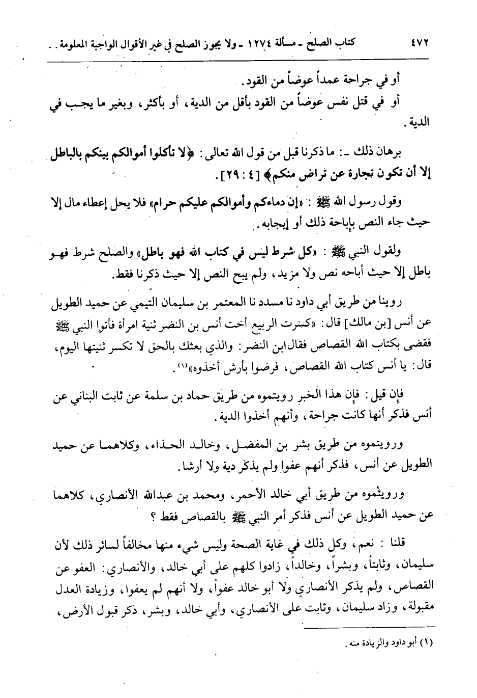 رُوِّينَا مِنْ طَرِيقِ أَبِي دَاوُد نا مُسَدَّدٌ نا الْمُعْتَمِرُ بْنُ سُلَيْمَانَ التَّيْمِيُّ عَنْ حُمَيْدٍ الطَّوِيلِ عَنْ أَنَسِ بْنِ مَالِكٍ قَالَ: «كَسَرَتْ الرُّبَيِّعُ أُخْتُ أَنَسِ بْنِ النَّضْرِ ثَنِيَّةَ امْرَأَةٍ فَأَتَوْا النَّبِيَّ - صَلَّى اللَّهُ عَلَيْهِ وَسَلَّمَ - فَقَضَى بِكِتَابِ اللَّهِ الْقِصَاصَ فَقَالَ ابْنُ النَّضْرِ: وَاَلَّذِي بَعَثَك بِالْحَقِّ لَا تُكْسَرُ ثَنِيَّتُهَا الْيَوْمَ، قَالَ: يَا أَنَسُ كِتَابُ اللَّهِ الْقِصَاصُ، فَرَضُوا بِأَرْشٍ أَخَذُوهُ» .