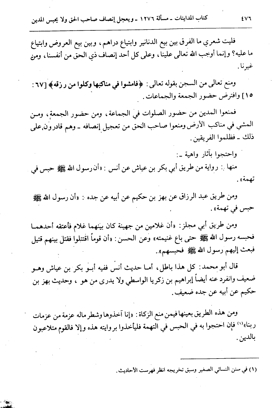 وَمِنْ هَذِهِ الطَّرِيقِ بِعَيْنِهَا فِيمَنْ مَنَعَ الزَّكَاةَ: «إنَّا آخِذُوهَا وَشَطْرَ مَالِهِ عَزْمَةٌ مِنْ عَزَمَاتِ رَبِّنَا» فَإِنْ احْتَجُّوا بِهِ فِي الْحَبْسِ فِي التُّهْمَةِ فَلْيَأْخُذُوا بِرِوَايَتِهِ هَذِهِ وَإِلَّا فَالْقَوْمُ مُتَلَاعِبُونَ بِالدَّيْنِ.