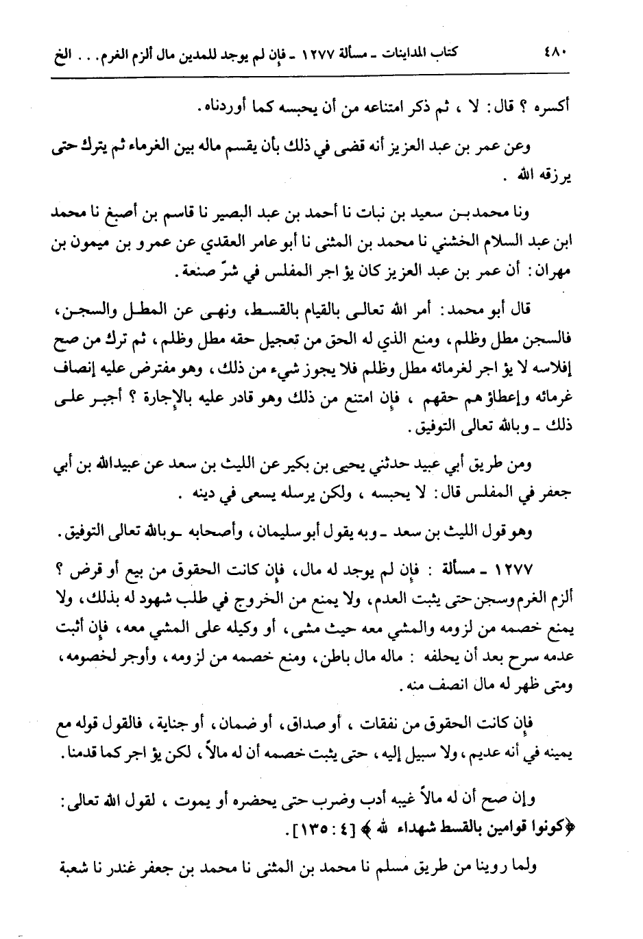 1277 - مَسْأَلَةٌ: فَإِنْ لَمْ يُوجَدْ لَهُ مَالٌ، فَإِنْ كَانَتْ الْحُقُوقُ مِنْ بَيْعٍ أَوْ قَرْضٍ؟ أُلْزِمَ الْغُرْمَ وَسُجِنَ حَتَّى يُثْبِتَ الْعَدَمَ، وَلَا يُمْنَعُ مِنْ الْخُرُوجِ فِي طَلَبِ شُهُودٍ لَهُ بِذَلِكَ، وَلَا يُمْنَعُ خَصْمُهُ مِنْ لُزُومِهِ وَالْمَشْيِ مَعَهُ حَيْثُ مَشَى، أَوْ وَكِيلُهُ عَلَى الْمَشْيِ مَعَهُ، فَإِنْ أَثْبَتَ عَدَمَهُ سُرِّحَ بَعْدَ أَنْ يُحَلِّفَهُ: مَا لَهُ مَالٌ بَاطِنٌ، وَمُنِعَ خَصْمُهُ مِنْ لَزَوْمه، وَأُوجِرَ لِخُصُومِهِ، وَمَتَى ظَهَرَ لَهُ مَالٌ أُنْصِفَ مِنْهُ.