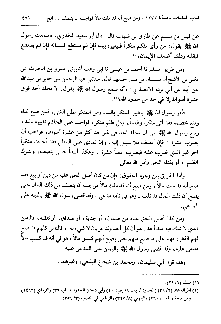 فَأَمَرَ رَسُولُ اللَّهِ - صَلَّى اللَّهُ عَلَيْهِ وَسَلَّمَ - بِتَغْيِيرِ الْمُنْكَرِ بِالْيَدِ، وَمِنْ الْمُنْكَرِ مَطْلُ الْغَنِيِّ، فَمَنْ صَحَّ غِنَاهُ وَمَنَعَ خَصْمَهُ فَقَدْ أَتَى مُنْكَرًا وَظُلْمًا، وَكُلُّ ظُلْمٍ مُنْكَرٌ، فَوَاجِبٌ عَلَى الْحَاكِمِ تَغْيِيرُهُ بِالْيَدِ، وَمَنَعَ رَسُولُ اللَّهِ - صَلَّى اللَّهُ عَلَيْهِ وَسَلَّمَ - مِنْ أَنْ يُجْلَدَ أَحَدٌ فِي غَيْرِ حَدٍّ أَكْثَرَ مِنْ عَشَرَةِ أَسْوَاطٍ؛ فَوَاجِبٌ أَنْ يُضْرَبَ عَشَرَةً؛ فَإِنْ أَنْصَفَ فَلَا سَبِيلَ إلَيْهِ، وَإِنْ تَمَادَى عَلَى الْمَطْلِ فَقَدْ أَحْدَثَ مُنْكَرًا آخَرَ غَيْرَ الَّذِي ضُرِبَ عَلَيْهِ فَيُضْرَبُ أَيْضًا عَشَرَةً، وَهَكَذَا أَبَدًا حَتَّى يُنْصِفَ، وَيَتْرُكَ الظُّلْمَ، أَوْ يَقْتُلَهُ الْحَقُّ وَأَمْرُ اللَّهِ تَعَالَى.