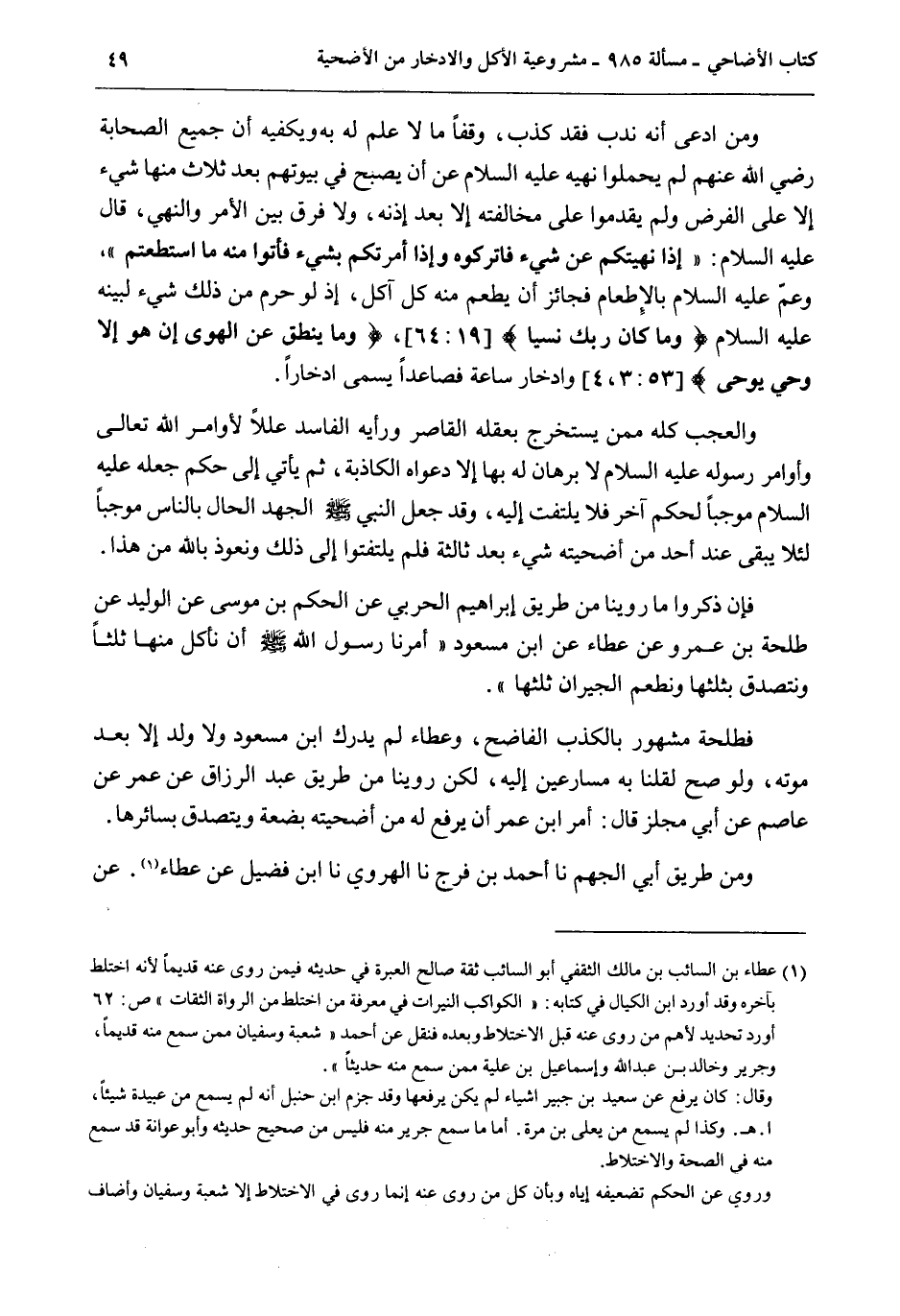 فَإِنْ ذَكَرُوا مَا رُوِّينَا مِنْ طَرِيقِ إبْرَاهِيم الْحَرْبِيِّ عَنْ الْحَكَمِ بْنِ مُوسَى عَنْ الْوَلِيدِ عَنْ طَلْحَةَ بْنِ عَمْرٍو عَنْ عَطَاءٍ عَنْ ابْنِ مَسْعُودٍ «أَمَرَنَا رَسُولُ اللَّهِ - صَلَّى اللَّهُ عَلَيْهِ وَسَلَّمَ - أَنْ نَأْكُلَ مِنْهَا ثُلُثًا وَنَتَصَدَّقَ بِثُلُثِهَا وَنُطْعِمَ الْجِيرَانَ ثُلُثَهَا» . فَطَلْحَةُ مَشْهُورٌ بِالْكَذِبِ الْفَاضِحِ، وَعَطَاءٌ لَمْ يُدْرِكْ ابْنَ مَسْعُودٍ وَلَا وُلِدَ إلَّا بَعْدَ مَوْتِهِ، وَلَوْ صَحَّ لَقُلْنَا بِهِ مُسَارِعِينَ إلَيْهِ، لَكِنْ رُوِّينَا مِنْ طَرِيقِ عَبْدِ الرَّزَّاقِ عَنْ عُمَرَ عَنْ عَاصِمٍ عَنْ أَبِي مِجْلَزٍ قَالَ: أَمَرَ ابْنُ عُمَرَ أَنْ يُرْفَعَ لَهُ مِنْ أُضْحِيَّتِهِ بَضْعَةٌ وَيُتَصَدَّقَ بِسَائِرِهَا.