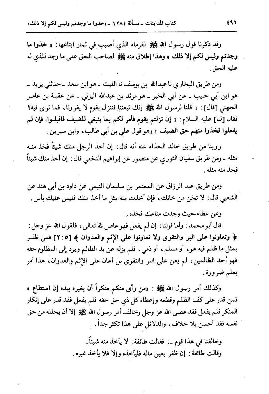 وَمِنْ طَرِيقِ الْبُخَارِيِّ نا عَبْدُ اللَّهِ بْنُ يُوسُفَ نا اللَّيْثُ هُوَ ابْنُ سَعْدٍ - حَدَّثَنِي يَزِيدُ هُوَ ابْنُ أَبِي حَبِيبٍ - عَنْ أَبِي الْخَيْرِ هُوَ مَرْثَدُ بْنُ عَبْدِ اللَّهِ الْيَزَنِيِّ - عَنْ عُقْبَةَ بْنِ عَامِرٍ الْجُهَنِيِّ [قَالَ] : «قُلْنَا لِرَسُولِ اللَّهِ - صَلَّى اللَّهُ عَلَيْهِ وَسَلَّمَ - إنَّكَ تَبْعَثُنَا فَنَنْزِلَ بِقَوْمٍ لَا يَقْرُونَا، فَمَا تَرَى فِيهِ؟ فَقَالَ لَنَا - عَلَيْهِ السَّلَامُ -: إنْ نَزَلْتُمْ بِقَوْمٍ فَأُمِرَ لَكُمْ بِمَا يَنْبَغِي لِلضَّيْفِ فَاقْبَلُوا، فَإِنْ لَمْ يَفْعَلُوا فَخُذُوا مِنْهُمْ حَقَّ الضَّيْفِ» وَهُوَ قَوْلُ عَلِيِّ بْنِ أَبِي طَالِبٍ، وَابْنِ سِيرِينَ. رُوِّينَا مِنْ طَرِيقِ خَالِدٍ الْحَذَّاءِ عَنْهُ أَنَّهُ قَالَ: إنْ أَخَذَ الرَّجُلُ مِنْك شَيْئًا فَخُذْ مِنْهُ مِثْلَهُ - وَمِنْ طَرِيقِ سُفْيَانَ الثَّوْرِيِّ عَنْ مَنْصُورٍ عَنْ إبْرَاهِيمَ النَّخَعِيِّ قَالَ: إنْ أَخَذَ مِنْك شَيْئًا فَخُذْ مِنْهُ مِثْلَهُ.