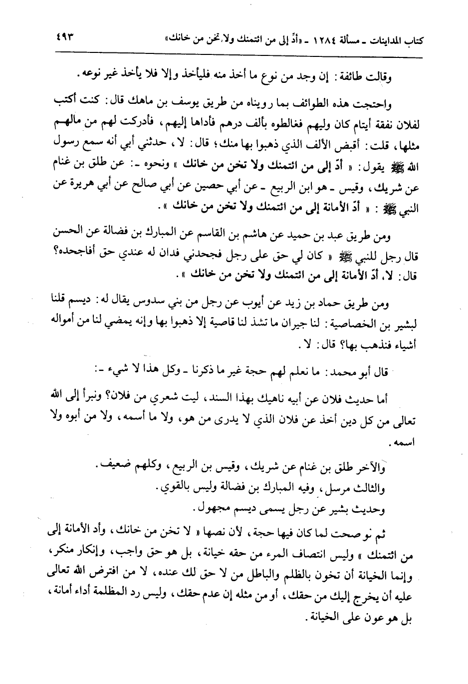 ثُمَّ لَوْ صَحَّتْ لَمَا كَانَ فِيهَا حُجَّةٌ؛ لِأَنَّ نَصَّهَا «لَا تَخُنْ مَنْ خَانَكَ، وَأَدِّ الْأَمَانَةَ إلَى مَنْ ائْتَمَنَكَ» وَلَيْسَ انْتِصَافُ الْمَرْءِ مِنْ حَقِّهِ خِيَانَةً، بَلْ هُوَ حَقٌّ وَاجِبٌ، وَإِنْكَارُ مُنْكِرٍ، وَإِنَّمَا الْخِيَانَةُ أَنَّ تَخُونَ بِالظُّلْمِ وَالْبَاطِلِ مَنْ لَا حَقَّ لَك عِنْدَهُ، وَلَا مِنْ افْتَرَضَ اللَّهُ تَعَالَى عَلَيْهِ أَنْ يُخْرِجَ إلَيْك مِنْ حَقِّك، أَوْ مِنْ مِثْلِهِ إنْ عَدَمَ حَقَّك، وَلَيْسَ رَدُّ الْمَظْلَمَةِ أَدَاءَ أَمَانَةٍ، بَلْ هُوَ عَوْنٌ عَلَى الْخِيَانَةِ.