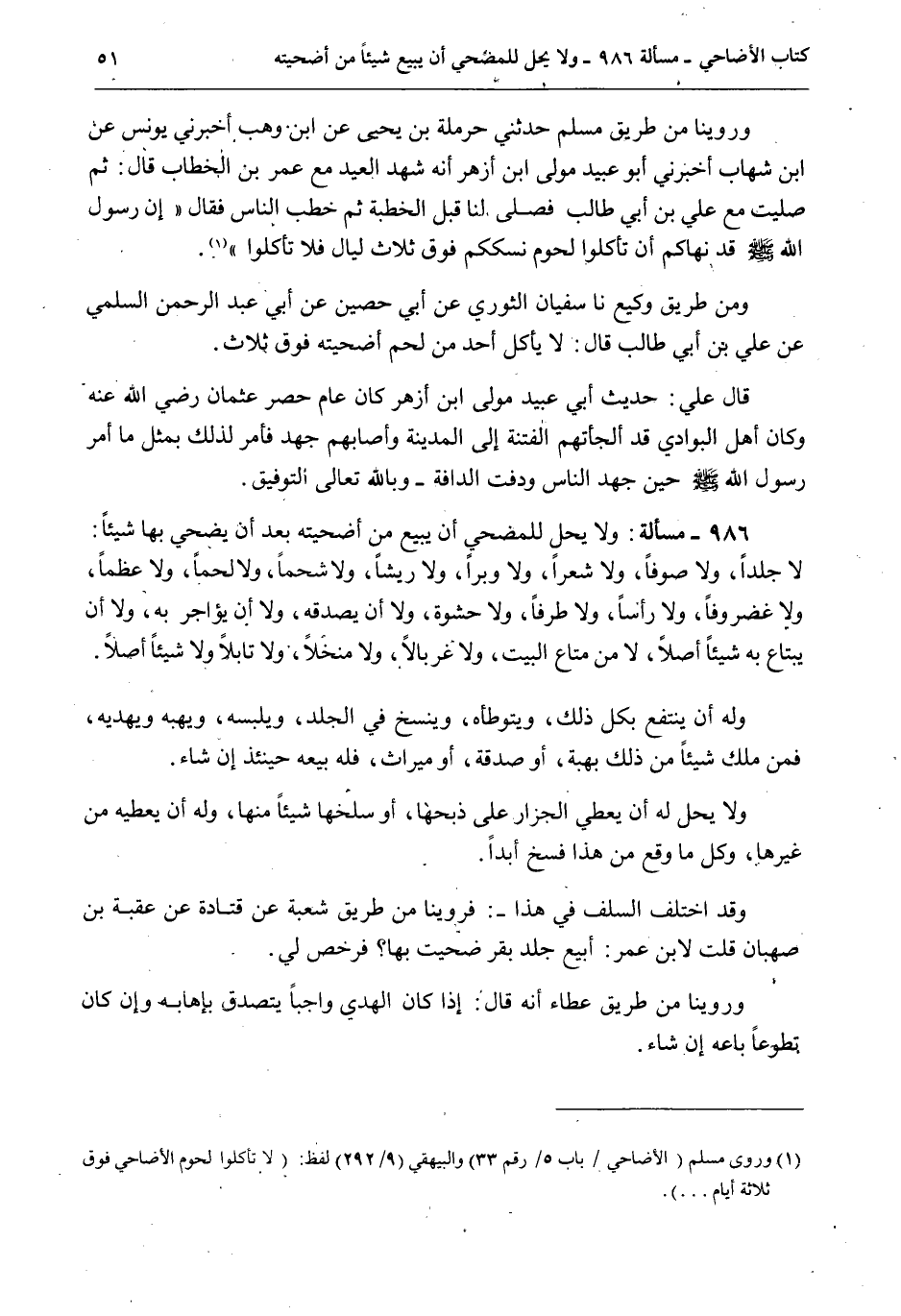 وَرُوِّينَا مِنْ طَرِيقِ مُسْلِمٍ حَدَّثَنِي حَرْمَلَةُ بْنُ يَحْيَى عَنْ ابْنِ وَهْبٍ أَخْبَرَنِي يُونُسُ عَنْ ابْنِ شِهَابٍ أَخْبَرَنِي أَبُو عُبَيْدٍ مَوْلَى ابْنِ أَزْهَرَ أَنَّهُ شَهِدَ الْعِيدَ مَعَ عُمَرَ بْنِ الْخَطَّابِ قَالَ: ثُمَّ صَلَّيْت مَعَ عَلِيِّ بْنِ أَبِي طَالِبٍ فَصَلَّى لَنَا قَبْلَ الْخُطْبَةِ ثُمَّ خَطَبَ النَّاسَ فَقَالَ «إنَّ رَسُولَ اللَّهِ - صَلَّى اللَّهُ عَلَيْهِ وَسَلَّمَ - قَدْ نَهَاكُمْ أَنْ تَأْكُلُوا لُحُومَ نُسُكِكُمْ فَوْقَ ثَلَاثِ لَيَالٍ فَلَا تَأْكُلُوا» . وَمِنْ طَرِيقِ وَكِيعٍ نَا سُفْيَانُ الثَّوْرِيُّ عَنْ أَبِي حُصَيْنٍ عَنْ أَبِي عَبْدِ الرَّحْمَنِ السُّلَمِيِّ عَنْ عَلِيِّ بْنِ أَبِي طَالِبٍ قَالَ: لَا يَأْكُلْ أَحَدٌ مِنْ لَحْمِ أُضْحِيَّتِهِ فَوْقَ ثَلَاثٍ.