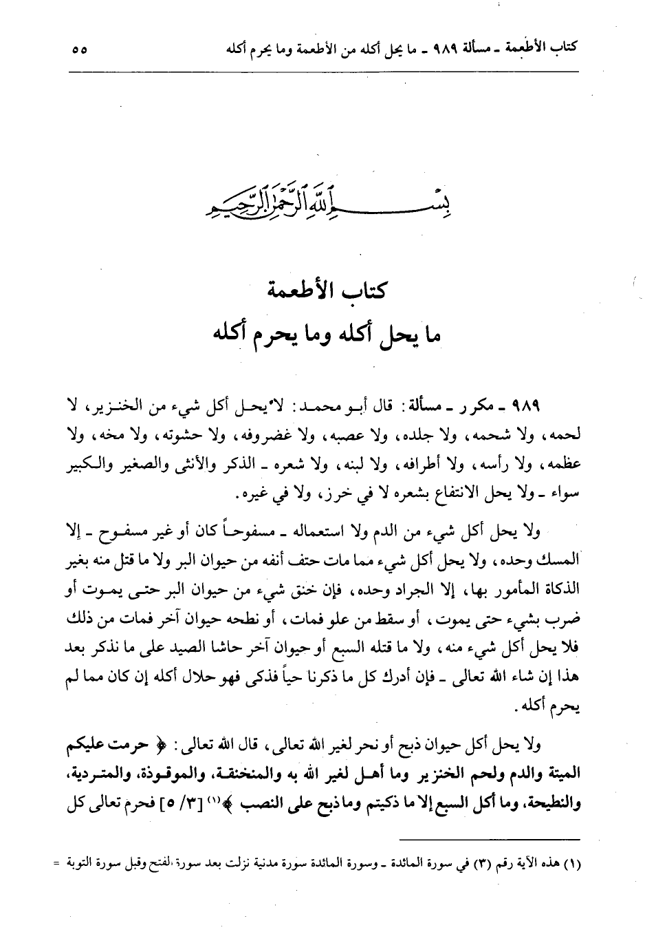 بِسْمِ اللَّهِ الرَّحْمَنِ الرَّحِيمِ كِتَابُ الْأَطْعِمَةِ مَا يَحِلُّ أَكْلُهُ وَمَا يَحْرُمُ أَكْلُهُ 989 - مُكَرَّرٌ مَسْأَلَةٌ: قَالَ أَبُو مُحَمَّدٍ: لَا يَحِلُّ أَكْلُ شَيْءٍ مِنْ الْخِنْزِيرِ، لَا لَحْمِهِ، وَلَا شَحْمِهِ، وَلَا جِلْدِهِ، وَلَا عَصَبِهِ، وَلَا غُضْرُوفِهِ، وَلَا حَشْوَتِهِ، وَلَا مُخِّهِ، وَلَا عَظْمِهِ، وَلَا رَأْسِهِ، وَلَا أَطْرَافِهِ، وَلَا لَبَنِهِ، وَلَا شَعْرِهِ - الذَّكَرُ وَالْأُنْثَى وَالصَّغِيرُ وَالْكَبِيرُ سَوَاءٌ - وَلَا يَحِلُّ الِانْتِفَاعُ بِشَعْرِهِ لَا فِي خَرَزٍ، وَلَا فِي غَيْرِهِ.