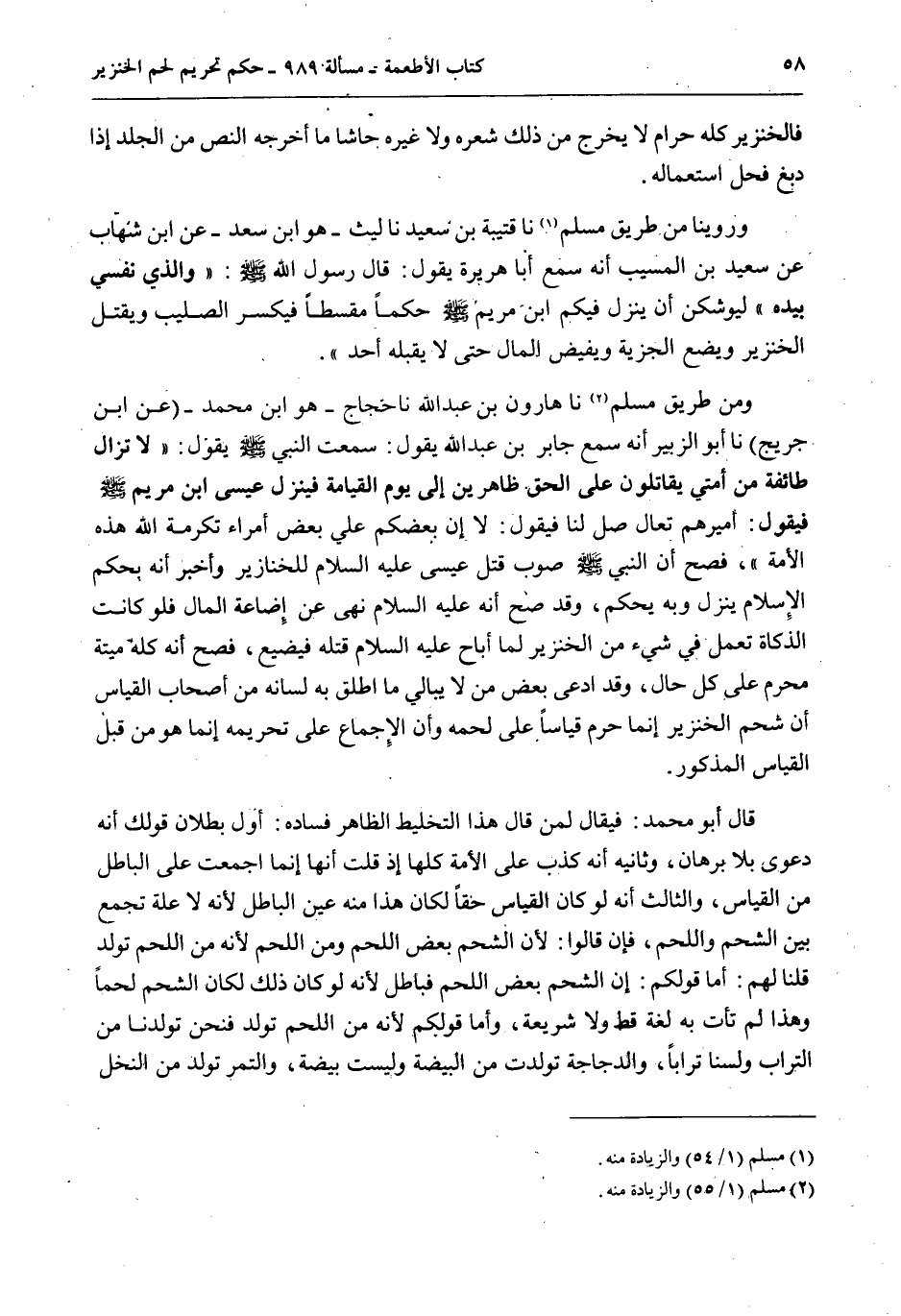 وَمِنْ طَرِيقِ مُسْلِمٍ نَا هَارُونُ بْنُ عَبْدُ اللَّهِ نَا حَجَّاجٌ هُوَ ابْنُ مُحَمَّدٍ - (عَنْ ابْنِ جُرَيْجٍ) نَا أَبُو الزُّبَيْرِ أَنَّهُ سَمِعَ جَابِرَ بْنَ عَبْدِ اللَّهِ يَقُولُ: سَمِعْت النَّبِيَّ - صَلَّى اللَّهُ عَلَيْهِ وَسَلَّمَ - يَقُولُ: «لَا تَزَالُ طَائِفَةٌ مِنْ أُمَّتِي يُقَاتِلُونَ عَلَى الْحَقِّ ظَاهِرِينَ إلَى يَوْمِ الْقِيَامَةِ فَيَنْزِلُ عِيسَى ابْنُ مَرْيَمَ - صَلَّى اللَّهُ عَلَيْهِ وَسَلَّمَ - فَيَقُولُ: أَمِيرُهُمْ تَعَالَ صَلِّ لَنَا فَيَقُولُ: لَا إنَّ بَعْضَكُمْ عَلَى بَعْضٍ أُمَرَاءُ تَكْرِمَةَ اللَّهِ هَذِهِ الْأُمَّةَ» ، فَصَحَّ أَنَّ النَّبِيَّ - صَلَّى اللَّهُ عَلَيْهِ وَسَلَّمَ - صَوَّبَ قَتْلَ عِيسَى - عَلَيْهِ السَّلَامُ - لِلْخَنَازِيرِ وَأَخْبَرَ أَنَّهُ بِحُكْمِ الْإِسْلَامِ يَنْزِلُ وَبِهِ يَحْكُمُ، وَقَدْ صَحَّ أَنَّهُ - عَلَيْهِ السَّلَامُ - نَهَى عَنْ إضَاعَةِ الْمَالِ فَلَوْ كَانَتْ الذَّكَاةُ تَعْمَلُ فِي شَيْءٍ مِنْ الْخِنْزِيرِ لَمَا أَبَاحَ - عَلَيْهِ السَّلَامُ - قَتْلَهُ فَيُضَيِّعُ، فَصَحَّ أَنَّهُ كُلَّهُ مَيْتَةٌ مُحَرَّمٌ عَلَى كُلِّ حَالٍ، وَقَدْ ادَّعَى بَعْضُ مَنْ لَا يُبَالِي مَا أَطْلَقَ بِهِ لِسَانَهُ مِنْ أَصْحَابِ الْقِيَاسِ أَنَّ شَحْمَ الْخِنْزِيرِ إنَّمَا حُرِّمَ قِيَاسًا عَلَى لَحْمِهِ وَأَنَّ الْإِجْمَاعَ عَلَى تَحْرِيمِهِ إنَّمَا هُوَ مِنْ قِبَلِ الْقِيَاسِ الْمَذْكُورِ.