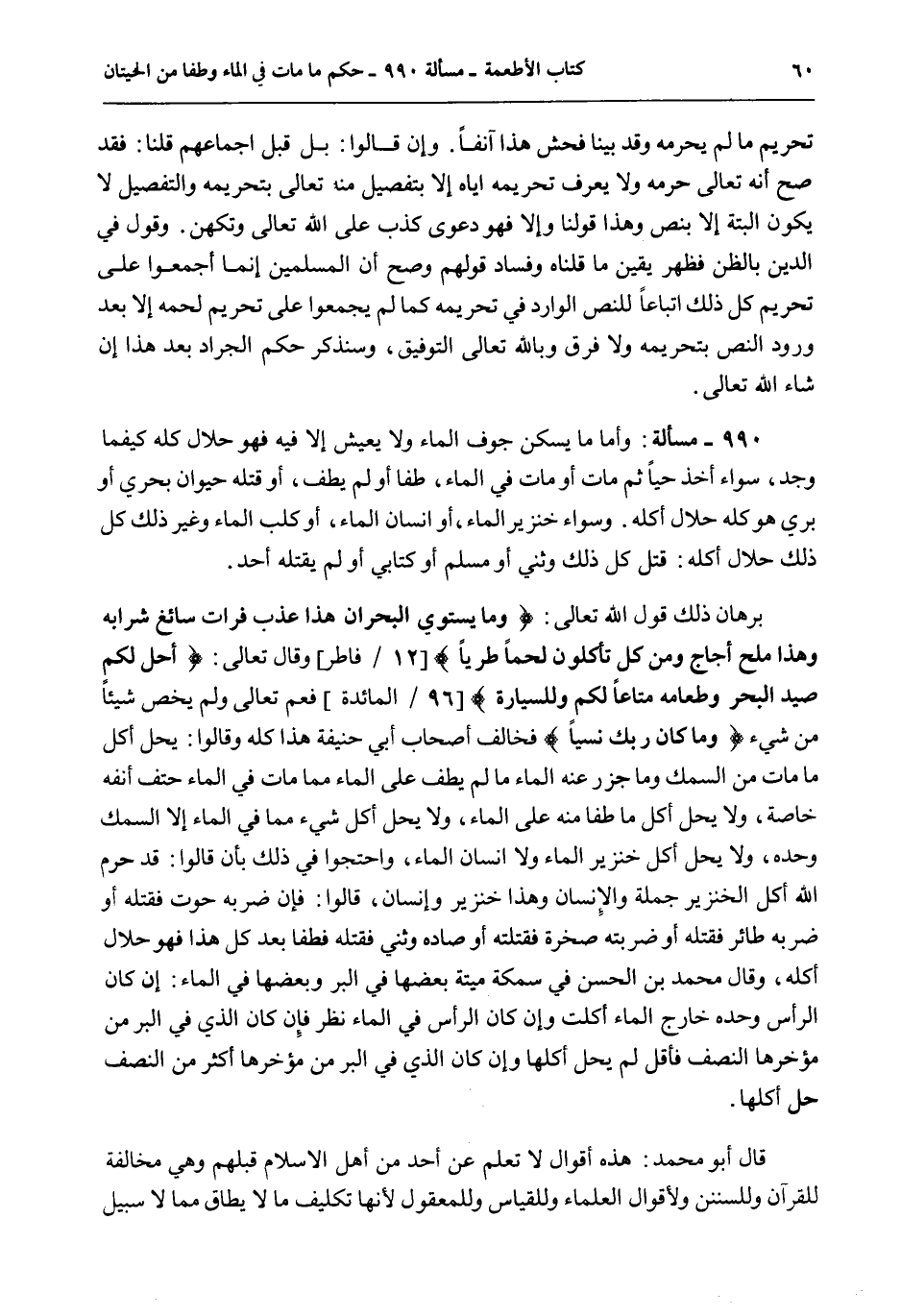 990 - مَسْأَلَةٌ: وَأَمَّا مَا يَسْكُنُ جَوْفَ الْمَاءِ وَلَا يَعِيشُ إلَّا فِيهِ فَهُوَ حَلَالٌ كُلُّهُ كَيْفَمَا وُجِدَ، سَوَاءٌ أُخِذَ حَيًّا ثُمَّ مَاتَ أَوْ مَاتَ فِي الْمَاءِ، طَفَا أَوْ لَمْ يَطْفُ، أَوْ قَتَلَهُ حَيَوَانٌ بَحْرِيٌّ أَوْ بَرِّيٌّ هُوَ كُلُّهُ حَلَالٌ أَكْلُهُ. وَسَوَاءٌ خِنْزِيرُ الْمَاءِ، أَوْ إنْسَانُ الْمَاءِ، أَوْ كَلْبُ الْمَاءِ وَغَيْرُ ذَلِكَ كُلُّ ذَلِكَ حَلَالٌ أَكْلُهُ: قَتَلَ كُلَّ ذَلِكَ وَثَنِيٌّ أَوْ مُسْلِمٌ أَوْ كِتَابِيٌّ أَوْ لَمْ يَقْتُلْهُ أَحَدٌ.