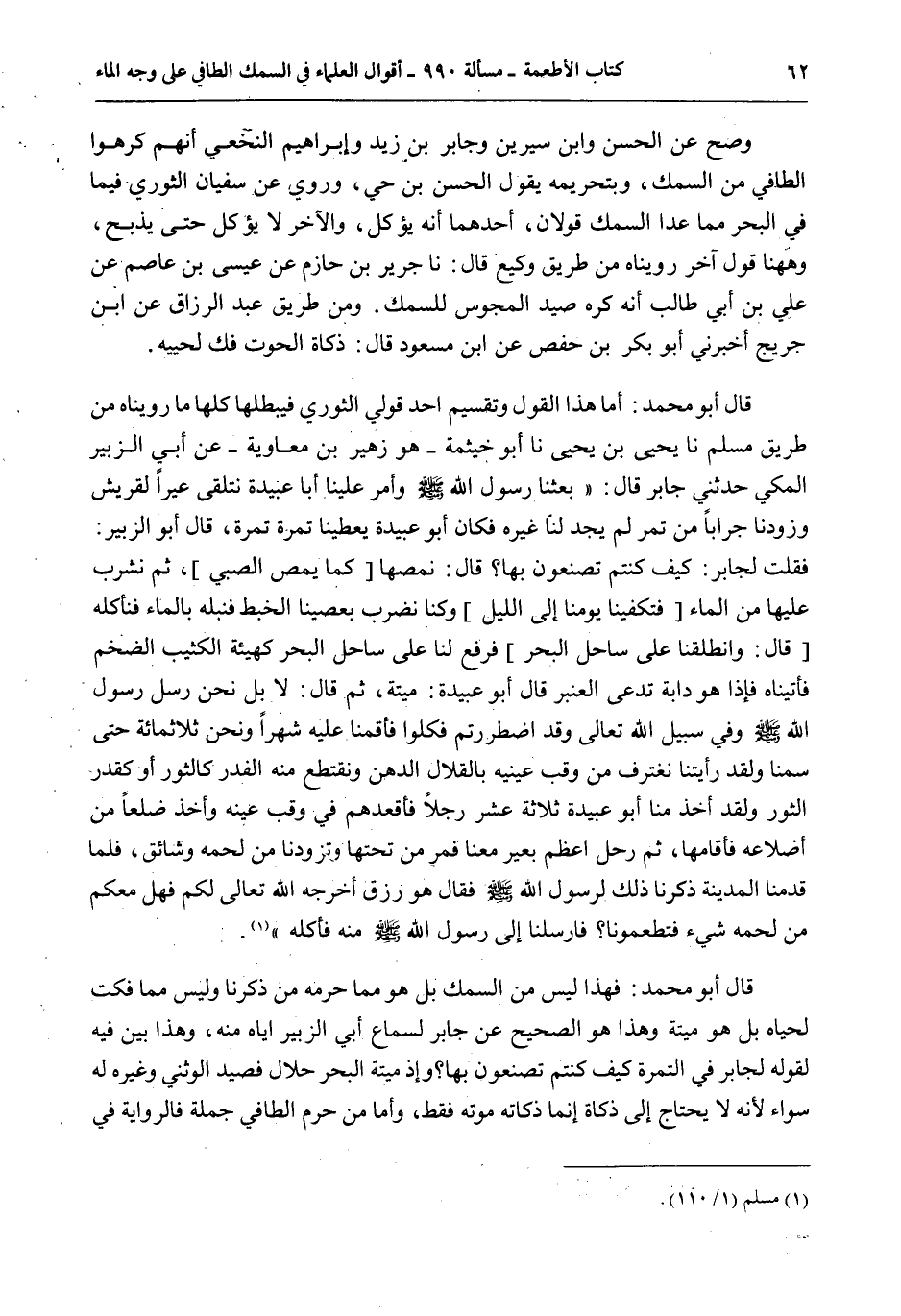 قَالَ أَبُو مُحَمَّدٍ: أَمَّا هَذَا الْقَوْلُ وَتَقْسِيمُ أَحَدِ قَوْلَيْ الثَّوْرِيِّ فَيُبْطِلُهَا كُلَّهَا مَا رُوِّينَاهُ مِنْ طَرِيقِ مُسْلِمٍ نَا يَحْيَى بْنُ يَحْيَى نَا أَبُو خَيْثَمَةَ هُوَ زُهَيْرُ بْنُ مُعَاوِيَةَ - عَنْ أَبِي الزُّبَيْرِ الْمَكِّيِّ حَدَّثَنِي جَابِرٌ قَالَ: «بَعَثَنَا رَسُولُ اللَّهِ - صَلَّى اللَّهُ عَلَيْهِ وَسَلَّمَ - وَأَمَّرَ عَلَيْنَا أَبَا عُبَيْدَةَ نَتَلَقَّى عِيرًا لِقُرَيْشٍ وَزَوَّدَنَا جِرَابًا مِنْ تَمْرٍ لَمْ يَجِدْ لَنَا غَيْرَهُ فَكَانَ أَبُو عُبَيْدَةَ يُعْطِينَا تَمْرَةً تَمْرَةً، قَالَ أَبُو الزُّبَيْرِ: فَقُلْت لِجَابِرٍ: كَيْفَ كُنْتُمْ تَصْنَعُونَ بِهَا؟ قَالَ: نَمُصُّهَا كَمَا يَمُصُّ الصَّبِيُّ ثُمَّ نَشْرَبُ عَلَيْهَا مِنْ الْمَاءِ فَتَكْفِينَا يَوْمَنَا إلَى اللَّيْلِ وَكُنَّا نَضْرِبُ بِعِصِيِّنَا الْخَبَطَ فَنَبُلُّهُ بِالْمَاءِ فَنَأْكُلُهُ قَالَ: وَانْطَلَقْنَا عَلَى سَاحِلِ الْبَحْرِ فَرُفِعَ لَنَا عَلَى سَاحِلِ الْبَحْرِ كَهَيْئَةِ الْكَثِيبِ الضَّخْمِ فَأَتَيْنَاهُ فَإِذَا هُوَ دَابَّةٌ تُدْعَى الْعَنْبَرَ قَالَ أَبُو عُبَيْدَةَ: مَيْتَةٌ، ثُمَّ قَالَ: لَا بَلْ نَحْنُ رُسُلُ رَسُولِ اللَّهِ - صَلَّى اللَّهُ عَلَيْهِ وَسَلَّمَ - وَفِي سَبِيلِ اللَّهِ تَعَالَى وَقَدْ اُضْطُرِرْتُمْ فَكُلُوا فَأَقَمْنَا عَلَيْهِ شَهْرًا وَنَحْنُ ثَلَاثُمِائَةٍ حَتَّى سَمِنَّا وَلَقَدْ رَأَيْتُنَا نَغْتَرِفُ مِنْ وَقْبِ عَيْنَيْهِ بِالْقِلَالِ الدُّهْنَ وَنَقْتَطِعُ مِنْهُ الْفِدَرَ كَالثَّوْرِ أَوْ كَقَدْرِ الثَّوْرِ وَلَقَدْ أَخَذَ مِنَّا أَبُو عُبَيْدَةَ ثَلَاثَةَ عَشَرَ رَجُلًا فَأَقْعَدَهُمْ فِي وَقْبِ عَيْنِهِ وَأَخَذَ ضِلْعًا مِنْ أَضْلَاعِهِ فَأَقَامَهَا، ثُمَّ رَحَلَ أَعْظَمَ بَعِيرٍ مَعَنَا فَمَرَّ مِنْ تَحْتِهَا وَتَزَوَّدْنَا مِنْ لَحْمِهِ وَشَائِقَ، فَلَمَّا قَدِمْنَا الْمَدِينَةَ ذَكَرْنَا ذَلِكَ لِرَسُولِ اللَّهِ - صَلَّى اللَّهُ عَلَيْهِ وَسَلَّمَ - فَقَالَ هُوَ رِزْقٌ أَخْرَجَهُ اللَّهُ تَعَالَى لَكُمْ فَهَلْ مَعَكُمْ مِنْ لَحْمِهِ شَيْءٌ فَتُطْعِمُونَا؟ فَأَرْسَلْنَا إلَى رَسُولِ اللَّهِ - صَلَّى اللَّهُ عَلَيْهِ وَسَلَّمَ - مِنْهُ فَأَكَلَهُ» .