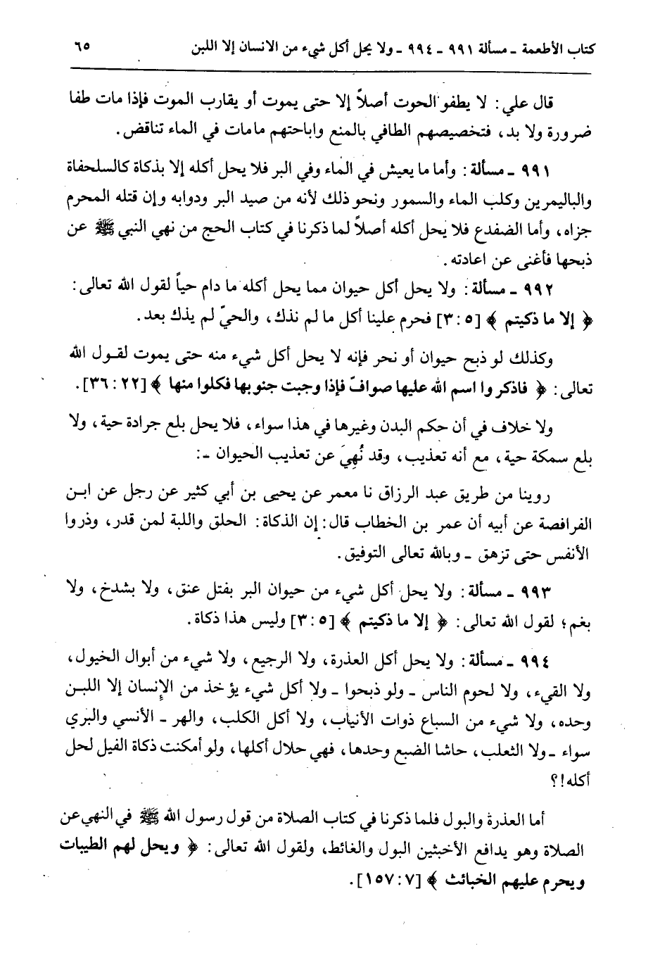 992 - مَسْأَلَةٌ: وَلَا يَحِلُّ أَكْلُ حَيَوَانٍ مِمَّا يَحِلُّ أَكْلُهُ مَا دَامَ حَيًّا لِقَوْلِ اللَّهِ تَعَالَى: {إِلا مَا ذَكَّيْتُمْ} [المائدة: 3] فَحَرَّمَ عَلَيْنَا أَكْلَ مَا لَمْ نُذَكِّ، وَالْحَيُّ لَمْ يُذَكَّ بَعْدُ. وَكَذَلِكَ لَوْ ذُبِحَ حَيَوَانٌ أَوْ نُحِرَ فَإِنَّهُ لَا يَحِلُّ أَكْلُ شَيْءٍ مِنْهُ حَتَّى يَمُوتَ لِقَوْلِ اللَّهِ تَعَالَى: {فَاذْكُرُوا اسْمَ اللَّهِ عَلَيْهَا صَوَافَّ فَإِذَا وَجَبَتْ جُنُوبُهَا فَكُلُوا مِنْهَا} [الحج: 36] .