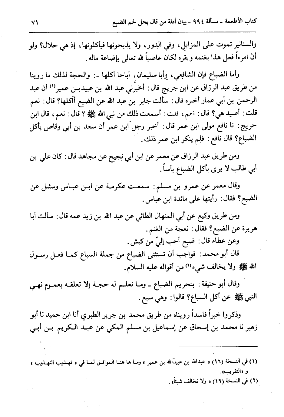 وَأَمَّا الضِّبَاعُ فَإِنَّ الشَّافِعِيَّ وَأَبَا سُلَيْمَانَ، أَبَاحَا أَكْلَهَا -: وَالْحُجَّةُ لِذَلِكَ مَا رُوِّينَا مِنْ طَرِيقِ عَبْدِ الرَّزَّاقِ عَنْ ابْنِ جُرَيْجٍ قَالَ: أَخْبَرَنِي عَبْدُ اللَّهِ بْنُ عُبَيْدِ بْنِ عُمَيْرٍ أَنَّ عَبْدَ الرَّحْمَنِ بْنَ أَبِي عَمَّارٍ أَخْبَرَهُ قَالَ: «سَأَلْتُ جَابِرَ بْنَ عَبْدِ اللَّهِ عَنْ الضَّبُعِ أَآكُلُهَا؟ قَالَ: نَعَمْ قُلْتُ: أَصَيْدٌ هِيَ؟ قَالَ: نَعَمْ، قُلْتُ: أَسَمِعْتَ ذَلِكَ مِنْ نَبِيِّ اللَّهِ - صَلَّى اللَّهُ عَلَيْهِ وَسَلَّمَ -؟ قَالَ: نَعَمْ» ، قَالَ ابْنُ جُرَيْجٍ: نَا نَافِعُ مَوْلَى ابْنِ عُمَرَ قَالَ: أَخْبَرَ رَجُلٌ ابْنَ عُمَرَ أَنَّ سَعْدَ بْنَ أَبِي وَقَّاصٍ يَأْكُلُ الضِّبَاعَ؟ قَالَ نَافِعٌ: فَلَمْ يُنْكِرْ ابْنُ عُمَرَ ذَلِكَ.