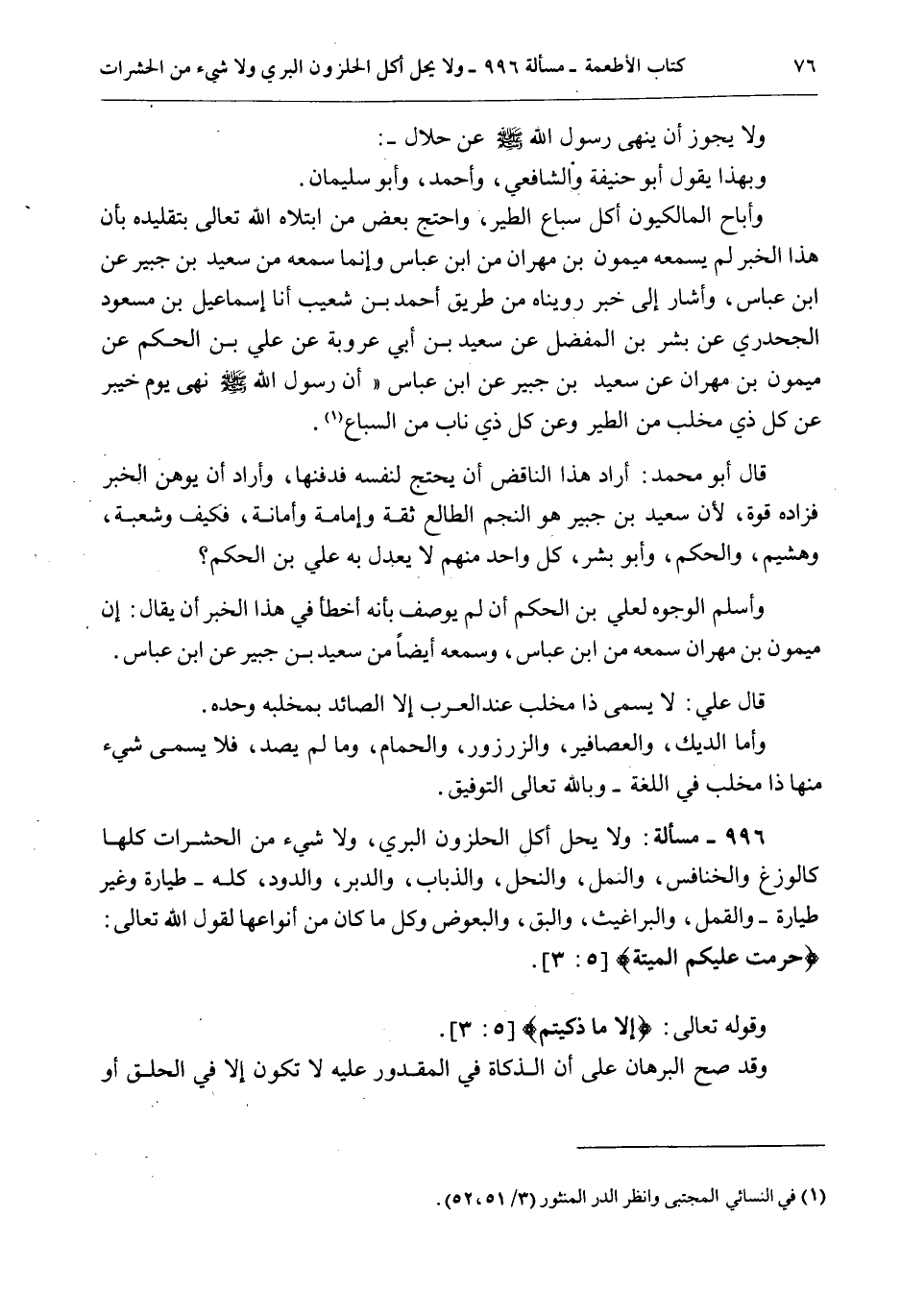 وَأَبَاحَ الْمَالِكِيُّونَ أَكْلَ سِبَاعِ الطَّيْرِ، وَاحْتَجَّ بَعْضُ مَنْ ابْتَلَاهُ اللَّهُ تَعَالَى بِتَقْلِيدِهِ بِأَنَّ هَذَا الْخَبَرَ لَمْ يَسْمَعْهُ مَيْمُونُ بْنُ مِهْرَانَ مِنْ ابْنِ عَبَّاسٍ وَإِنَّمَا سَمِعَهُ مِنْ سَعِيدِ بْنِ جُبَيْرٍ عَنْ ابْنِ عَبَّاسٍ، وَأَشَارَ إلَى خَبَرٍ رُوِّينَاهُ مِنْ طَرِيقِ أَحْمَدَ بْنِ شُعَيْبَ أَنَا إسْمَاعِيلُ بْنُ مَسْعُودٍ الْجَحْدَرِيُّ عَنْ بِشْرِ بْنِ الْمُفَضَّلِ عَنْ سَعِيدِ بْنِ أَبِي عَرُوبَةَ عَنْ عَلِيِّ بْنِ الْحَكَمِ عَنْ مَيْمُونِ بْنِ مِهْرَانَ عَنْ سَعِيدِ بْنِ جُبَيْرٍ عَنْ ابْنِ عَبَّاسٍ «أَنَّ رَسُولَ اللَّهِ - صَلَّى اللَّهُ عَلَيْهِ وَسَلَّمَ - نَهَى يَوْمَ خَيْبَرَ عَنْ كُلِّ ذِي مِخْلَبٍ مِنْ الطَّيْرِ وَعَنْ كُلِّ ذِي نَابٍ مِنْ السِّبَاعِ» .