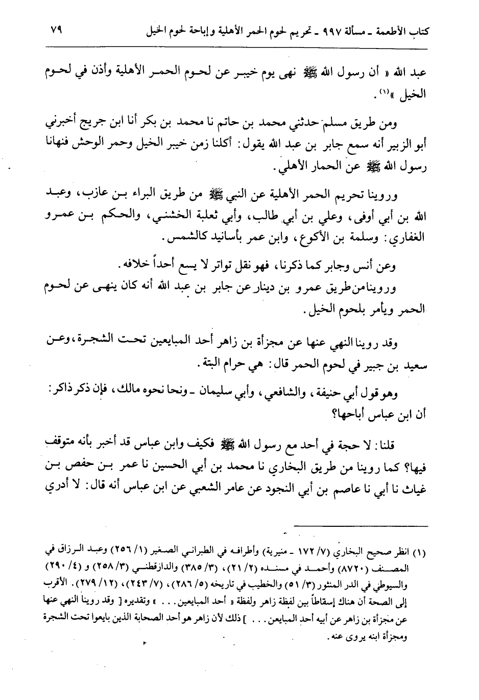 «أَنَّ رَسُولَ اللَّهِ - صَلَّى اللَّهُ عَلَيْهِ وَسَلَّمَ - نَهَى يَوْمَ خَيْبَرَ عَنْ لُحُومِ الْحُمُرِ الْأَهْلِيَّةِ وَأَذِنَ فِي لُحُومِ الْخَيْلِ» .