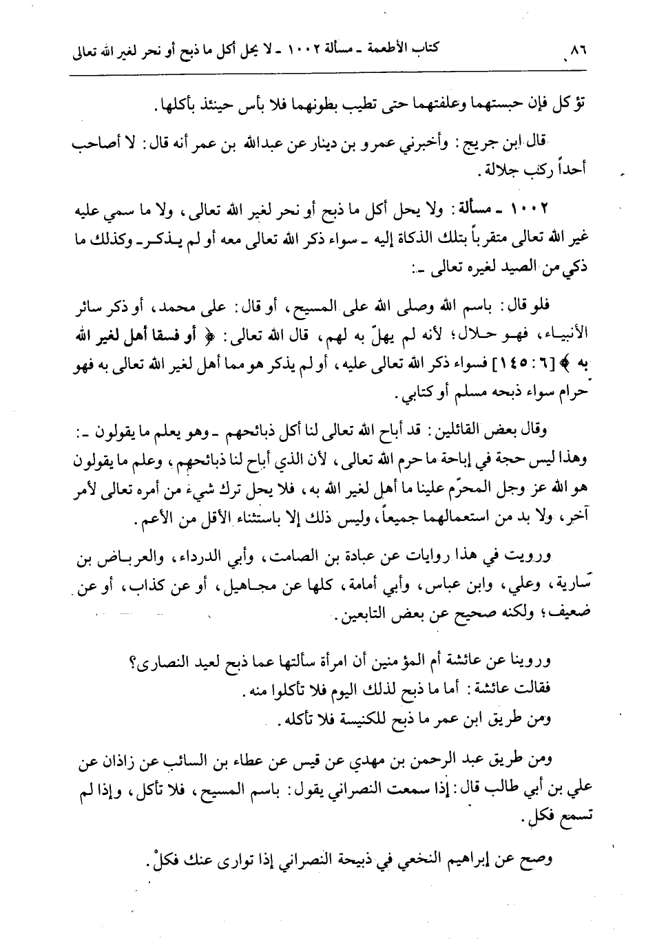 1002 - مَسْأَلَةٌ: وَلَا يَحِلُّ أَكْلُ مَا ذُبِحَ أَوْ نُحِرَ لِغَيْرِ اللَّهِ تَعَالَى، وَلَا مَا سُمِّيَ عَلَيْهِ غَيْرُ اللَّهِ تَعَالَى مُتَقَرِّبًا بِتِلْكَ الذَّكَاةِ إلَيْهِ - سَوَاءٌ ذَكَرَ اللَّهَ تَعَالَى مَعَهُ أَوْ لَمْ يَذْكُرْ - وَكَذَلِكَ مَا ذُكِّيَ مِنْ الصَّيْدِ لِغَيْرِهِ تَعَالَى -: فَلَوْ قَالَ: بِاسْمِ اللَّهِ وَصَلَّى اللَّهُ عَلَى الْمَسِيحِ، أَوْ قَالَ: عَلَى مُحَمَّدٍ، أَوْ ذَكَرَ سَائِرَ الْأَنْبِيَاءِ، فَهُوَ حَلَالٌ؛ لِأَنَّهُ لَمْ يُهِلَّ بِهِ لَهُمْ، قَالَ اللَّهُ تَعَالَى: {أَوْ فِسْقًا أُهِلَّ لِغَيْرِ اللَّهِ بِهِ} [الأنعام: 145] فَسَوَاءٌ ذُكِرَ اللَّهُ تَعَالَى عَلَيْهِ، أَوْ لَمْ يُذْكَرْ هُوَ مِمَّا أُهِلَّ لِغَيْرِ اللَّهِ تَعَالَى بِهِ فَهُوَ حَرَامٌ سَوَاءٌ ذَبَحَهُ مُسْلِمٌ أَوْ كِتَابِيٌّ.