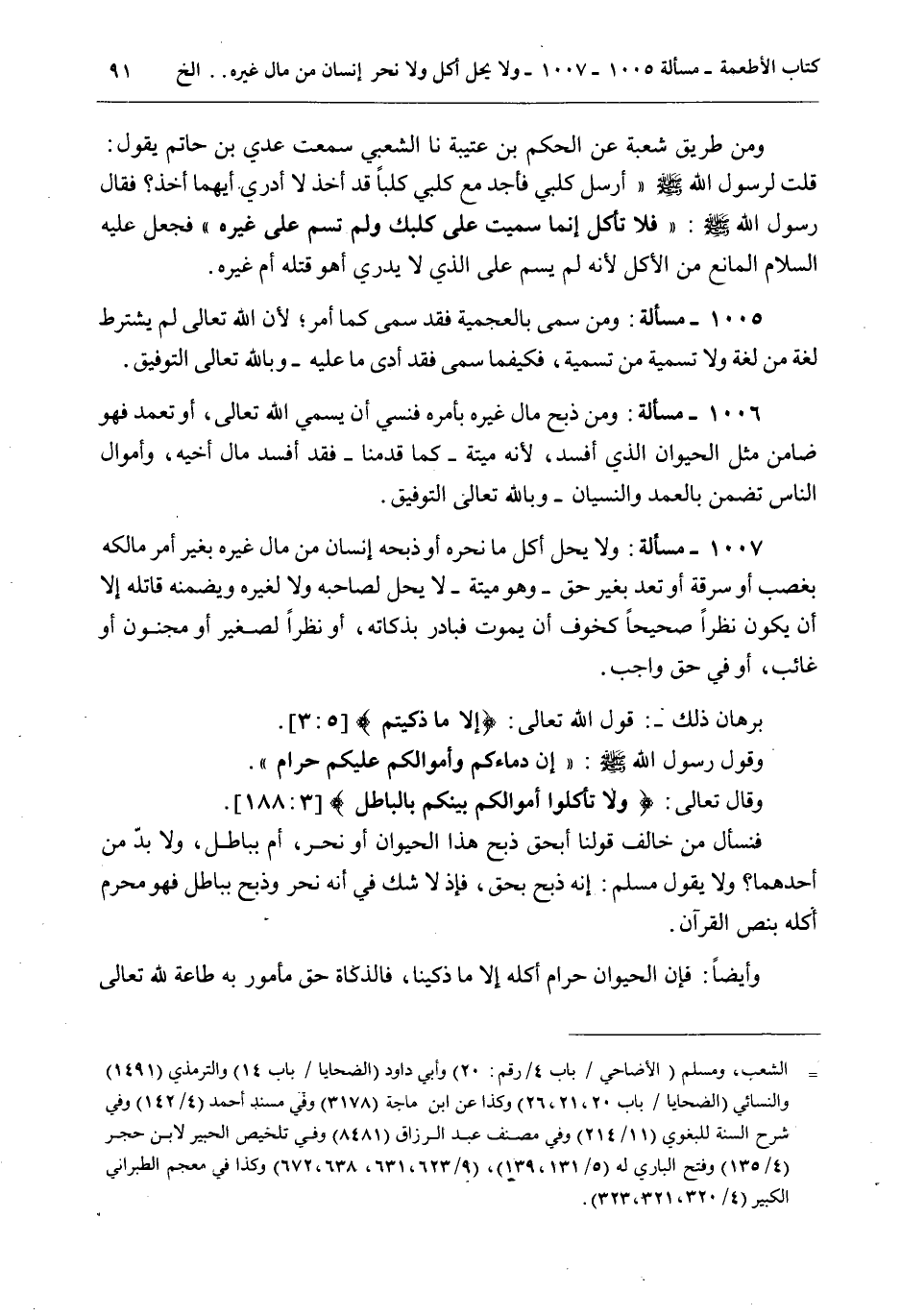 فَنَسْأَلُ مَنْ خَالَفَ قَوْلَنَا أَبِحَقٍّ ذَبَحَ هَذَا الْحَيَوَانَ أَوْ نَحَرَ، أَمْ بِبَاطِلٍ، وَلَا بُدَّ مِنْ أَحَدِهِمَا؟ وَلَا يَقُولُ مُسْلِمٌ: إنَّهُ ذَبَحَ بِحَقٍّ، فَإِذْ لَا شَكَّ فِي أَنَّهُ نَحَرَ وَذَبَحَ بِبَاطِلٍ فَهُوَ مُحَرَّمٌ أَكْلُهُ بِنَصِّ الْقُرْآنِ.