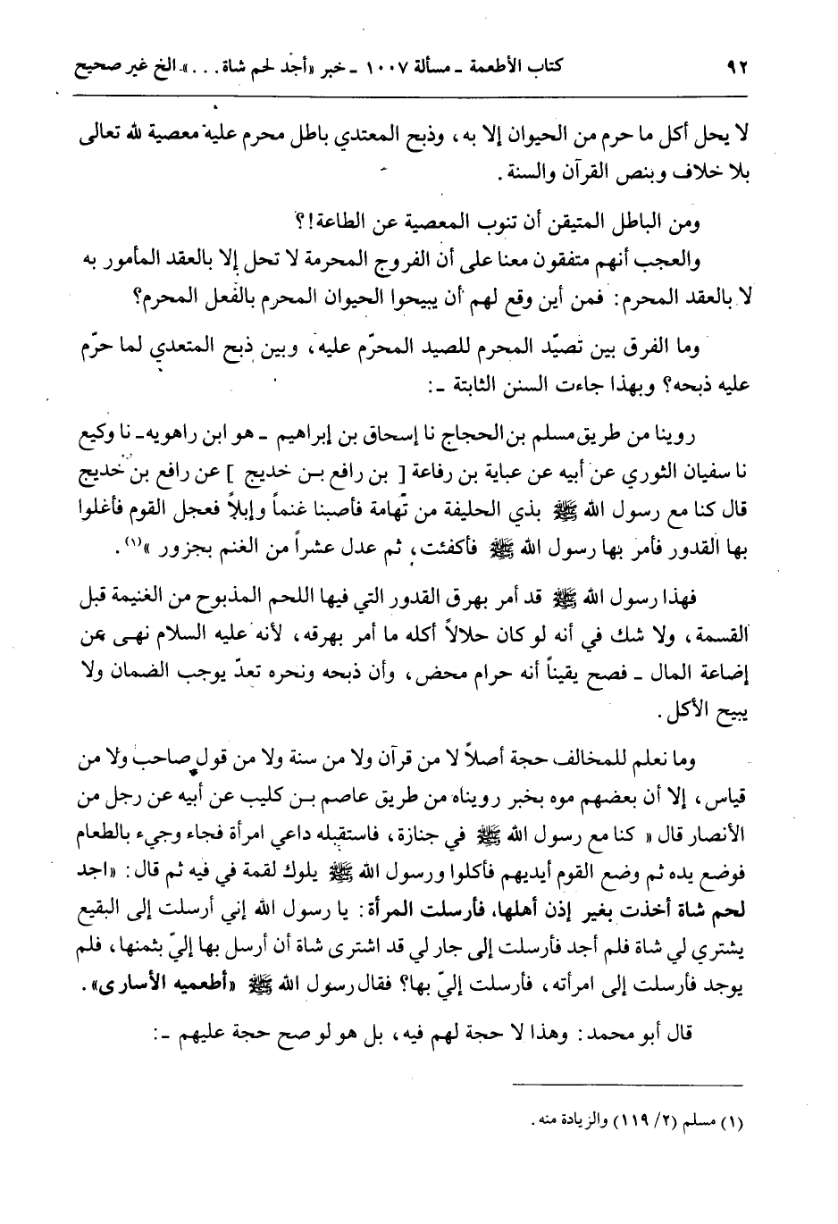 فَهَذَا رَسُولُ اللَّهِ - صَلَّى اللَّهُ عَلَيْهِ وَسَلَّمَ - قَدْ أَمَرَ بِهَرْقِ الْقُدُورِ الَّتِي فِيهَا اللَّحْمُ الْمَذْبُوحُ مِنْ الْغَنِيمَةِ قَبْلَ الْقِسْمَةِ، وَلَا شَكَّ فِي أَنَّهُ لَوْ كَانَ حَلَالًا أَكْلُهُ مَا أَمَرَ بِهَرْقِهِ، لِأَنَّهُ - عَلَيْهِ السَّلَامُ - نَهَى عَنْ إضَاعَةِ الْمَالِ - فَصَحَّ يَقِينًا أَنَّهُ حَرَامٌ مَحْضٌ، وَأَنَّ ذَبْحَهُ وَنَحْرَهُ تَعَدٍّ يُوجِبُ الضَّمَانَ وَلَا يُبِيحُ الْأَكْلَ.