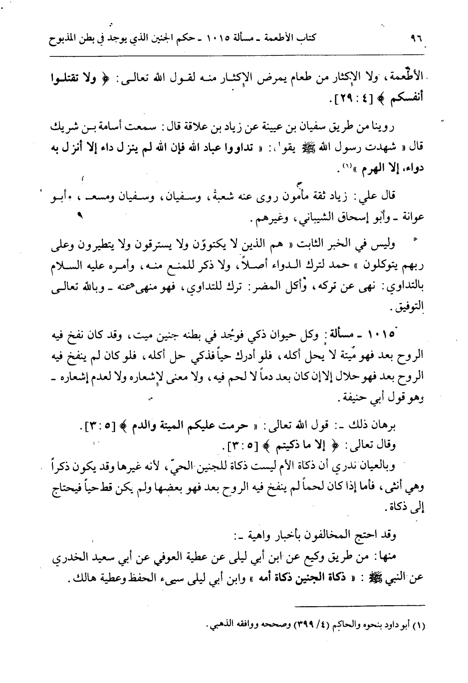 1015 - مَسْأَلَةٌ: وَكُلُّ حَيَوَانٍ ذَكِيٍّ فَوُجِدَ فِي بَطْنِهِ جَنِينٌ مَيِّتٌ، وَقَدْ كَانَ نُفِخَ فِيهِ الرُّوحُ بَعْدُ فَهُوَ مَيِّتَةٌ لَا يَحِلُّ أَكْلُهُ، فَلَوْ أُدْرِكَ حَيًّا فَذُكِّيَ حَلَّ أَكْلُهُ، فَلَوْ كَانَ لَمْ يُنْفَخْ فِيهِ الرُّوحُ بَعْدُ فَهُوَ حَلَالٌ إلَّا إنْ كَانَ بَعْدُ دَمًا لَا لَحْمَ فِيهِ، وَلَا مَعْنَى لِإِشْعَارِهِ وَلَا لِعَدَمِ إشْعَارِهِ - وَهُوَ قَوْلُ أَبِي حَنِيفَةَ. بُرْهَانُ ذَلِكَ -: قَوْلُ اللَّهِ تَعَالَى: {حُرِّمَتْ عَلَيْكُمُ الْمَيْتَةُ وَالدَّمُ} [المائدة: 3] . وَقَالَ تَعَالَى: {إِلا مَا ذَكَّيْتُمْ} [المائدة: 3] . وَبِالْعِيَانِ نَدْرِي أَنَّ ذَكَاةَ الْأُمِّ لَيْسَتْ ذَكَاةً لِلْجَنِينِ الْحَيِّ، لِأَنَّهُ غَيْرُهَا وَقَدْ يَكُونُ ذَكَرًا وَهِيَ أُنْثَى، فَأَمَّا إذَا كَانَ لَحْمًا لَمْ يُنْفَخْ فِيهِ الرُّوحُ بَعْدُ فَهُوَ بَعْضُهَا وَلَمْ يَكُنْ قَطُّ حَيًّا فَيَحْتَاجُ إلَى ذَكَاةٍ.