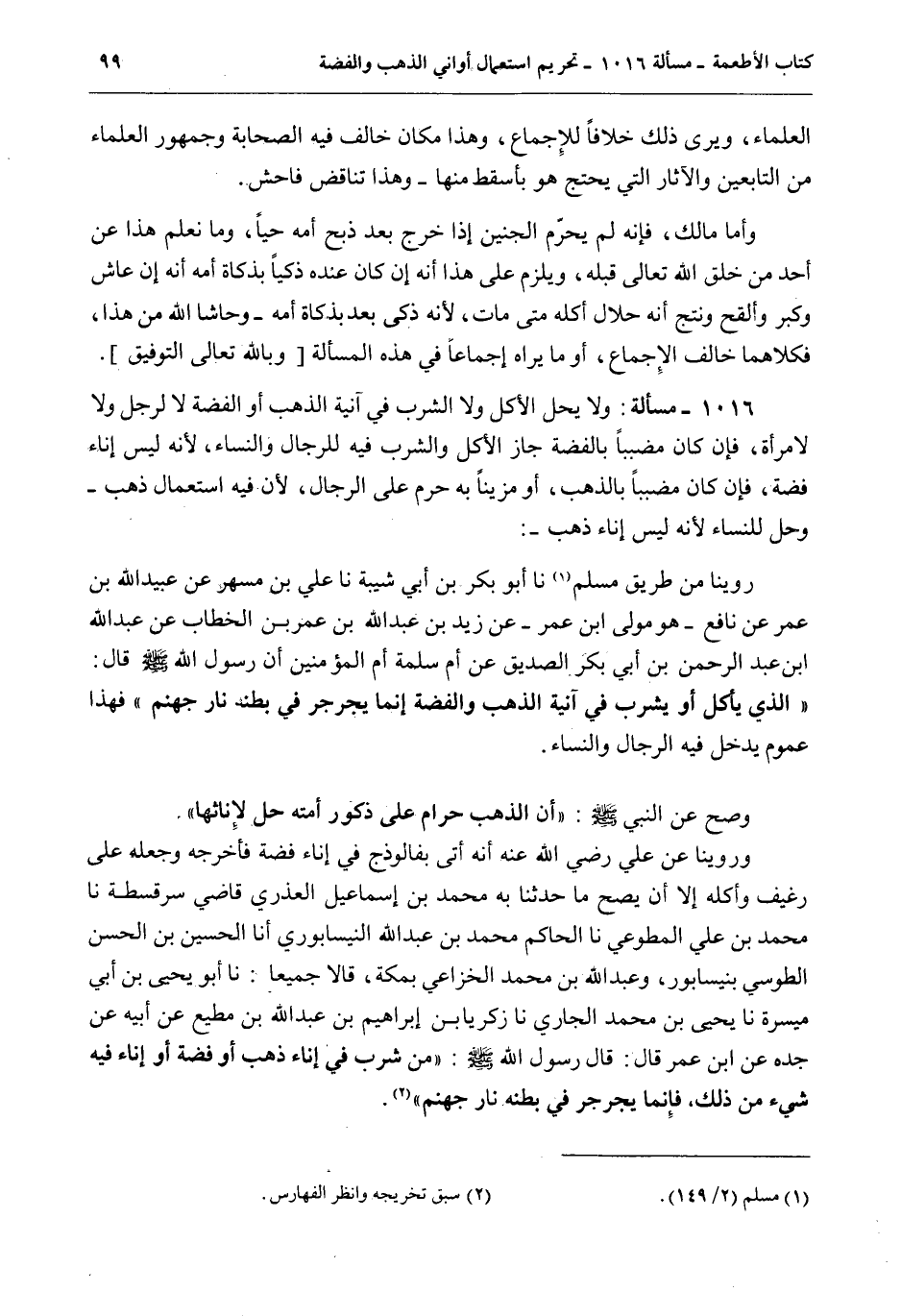 1016 - مَسْأَلَةٌ: وَلَا يَحِلُّ الْأَكْلُ وَلَا الشُّرْبُ فِي آنِيَةِ الذَّهَبِ أَوْ الْفِضَّةِ لَا لِرَجُلٍ وَلَا لِامْرَأَةٍ، فَإِنْ كَانَ مُضَبَّبًا بِالْفِضَّةِ جَازَ الْأَكْلُ وَالشُّرْبُ فِيهِ لِلرِّجَالِ وَالنِّسَاءِ، لِأَنَّهُ لَيْسَ إنَاءَ فِضَّةٍ، فَإِنْ كَانَ مُضَبَّبًا بِالذَّهَبِ، أَوْ مُزَيَّنًا بِهِ حَرُمَ عَلَى الرِّجَالِ، لِأَنَّ فِيهِ اسْتِعْمَالَ ذَهَبٍ - وَحَلَّ لِلنِّسَاءِ لِأَنَّهُ لَيْسَ إنَاءُ ذَهَبٍ -: رُوِّينَا مِنْ طَرِيقِ مُسْلِمٍ نا أَبُو بَكْرِ بْنُ أَبِي شَيْبَةَ نا عَلِيُّ بْنُ مُسْهِرٍ عَنْ عُبَيْدِ اللَّهِ بْنِ عُمَرَ عَنْ نَافِعٍ - هُوَ مَوْلَى ابْنِ عُمَرَ - عَنْ زَيْدِ بْنِ عَبْدِ اللَّهِ بْنِ عُمَرَ بْنِ الْخَطَّابِ عَنْ عَبْدِ اللَّهِ بْنِ عَبْدِ الرَّحْمَنِ بْنِ أَبِي بَكْرٍ الصِّدِّيقِ عَنْ أُمِّ سَلَمَةَ أُمِّ الْمُؤْمِنِينَ أَنَّ رَسُولَ اللَّهِ - صَلَّى اللَّهُ عَلَيْهِ وَسَلَّمَ - قَالَ: «الَّذِي يَأْكُلُ أَوْ يَشْرَبُ فِي آنِيَةِ الذَّهَبِ وَالْفِضَّةِ إنَّمَا يُجَرْجِرُ فِي بَطْنِهِ نَارَ جَهَنَّمَ» فَهَذَا عُمُومٌ يَدْخُلُ فِيهِ الرِّجَالُ وَالنِّسَاءُ. وَصَحَّ عَنْ النَّبِيِّ - صَلَّى اللَّهُ عَلَيْهِ وَسَلَّمَ -: «أَنَّ الذَّهَبَ حَرَامٌ عَلَى ذُكُورِ أُمَّتِهِ حِلٌّ لِإِنَاثِهَا» .
