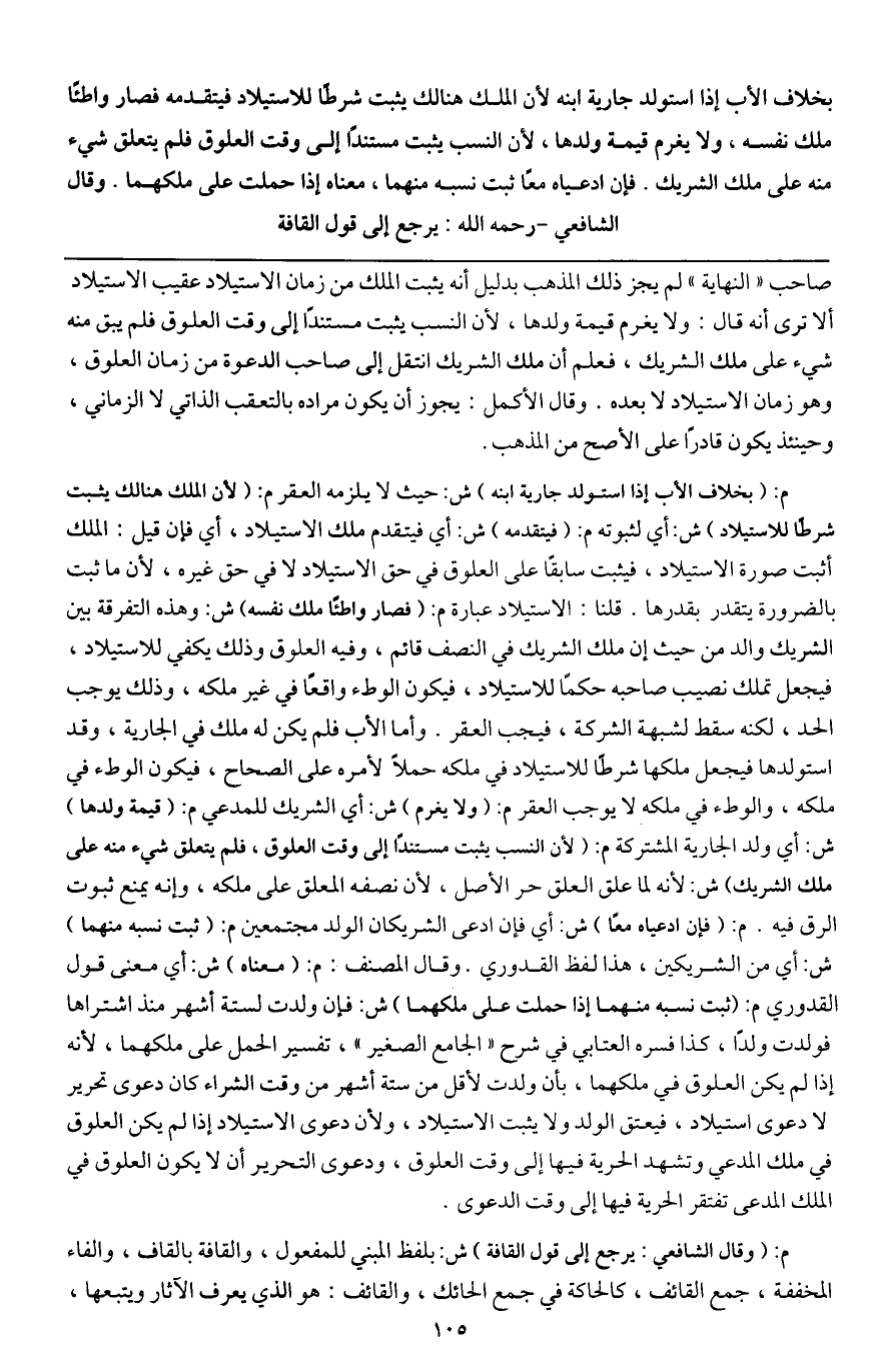 ـــــــــــــــــــــــــــــQصاحب " النهاية " لم يجز ذلك المذهب بدليل أنه يثبت الملك من زمان الاستيلاد عقيب الاستيلاد ألا ترى أنه قال: ولا يغرم قيمة ولدها، لأن النسب يثبت مستنداً إلى وقت العلوق فلم يبق منه شيء على ملك الشريك، فعلم أن ملك الشريك انتقل إلى صاحب الدعوة من زمان العلوق، وهو زمان الاستيلاد لا بعده. وقال الأكمل: يجوز أن يكون مراده بالتعقيب الذاتي لا الزماني، وحينئذ يكون قادراً على الأصح من المذهب.