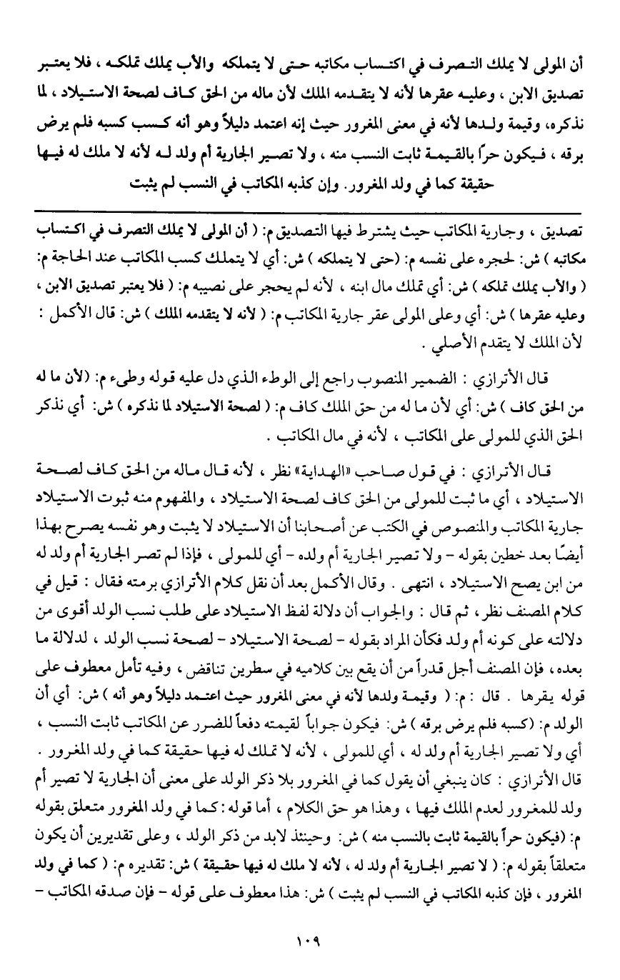 ـــــــــــــــــــــــــــــQتصديق، وجارية المكاتب حيث يشترط فيها التصديق. م: (أن المولى لا يملك التصرف في اكتساب مكاتبه) . ش: لحجره على نفسه. م: (حتى لا يتملكه) . ش: أي لا يتملك كسب المكاتب عند الحاجة. م: (والأب يملك تملكه) . ش: أي تملك مال ابنه، لأنه لم يحجر على نصيبه. م: (فلا يعتبر تصديق الابن، وعليه عقرها) . ش: أي وعلى المولى عقر جارية المكاتب. م: (لأنه لا يتقدمه الملك) . ش: قال الأكمل: لأن الملك لا يتقدم الأصلي.