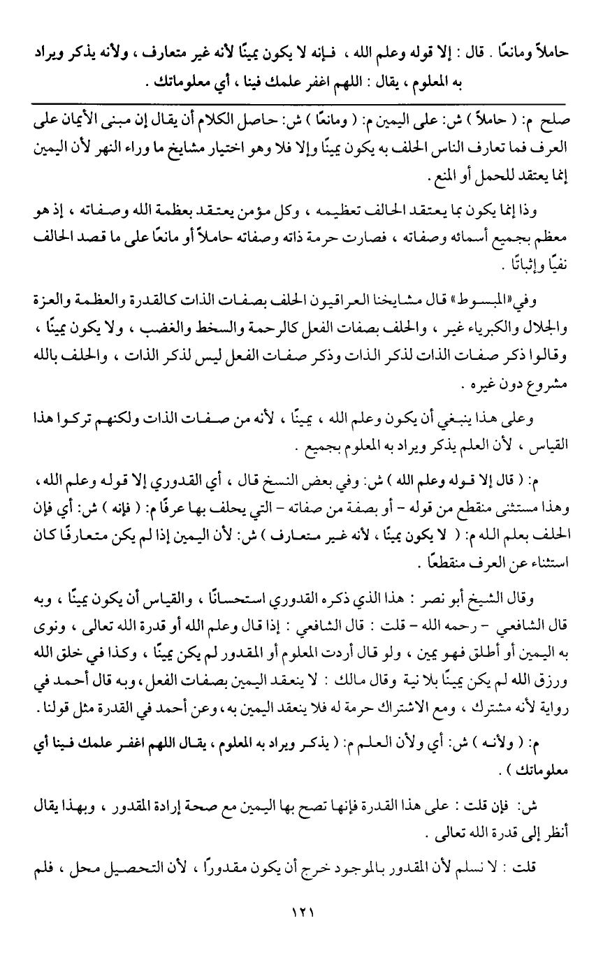 وعلى هذا ينبغي أن يكون وعلم الله، يميناً، لأنه من صفات الذات ولكنهم تركوا هذا القياس، لأن العلم يذكر ويراد به المعلوم بجميع.