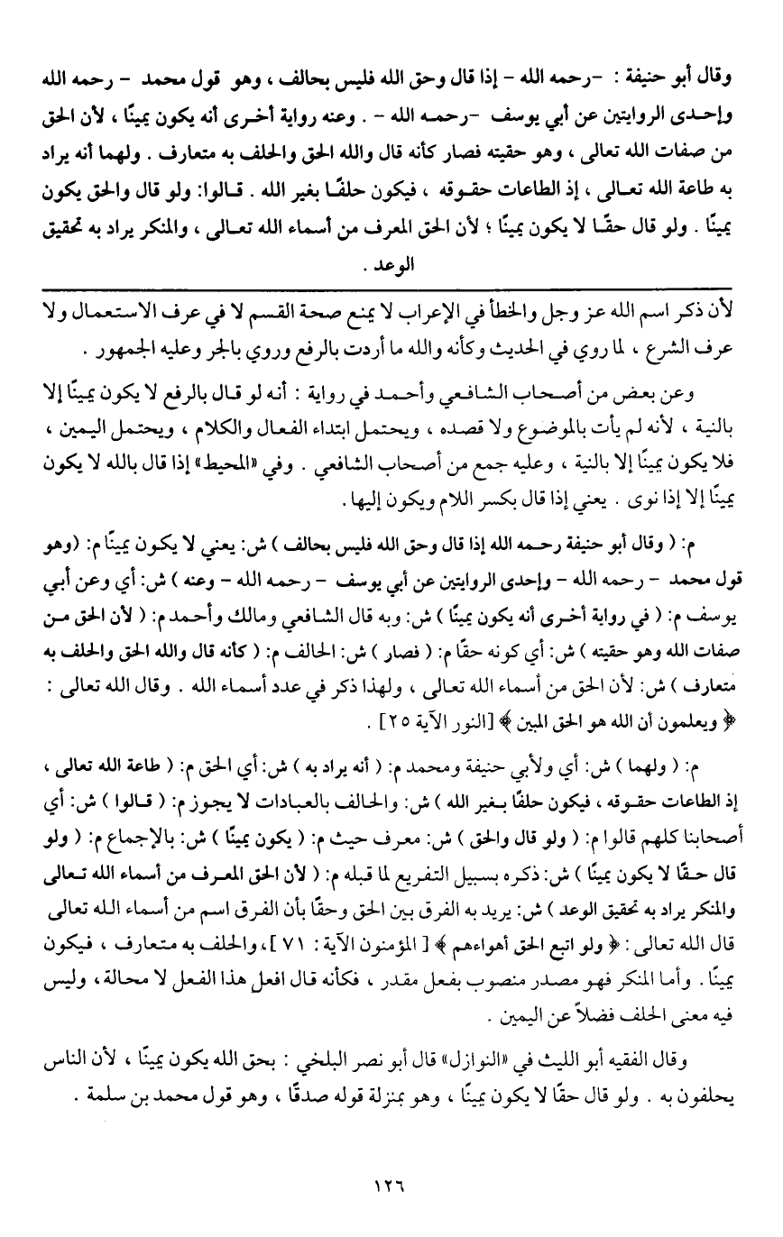 وقال الفقيه أبو الليث في " النوازل " قال أبو نصر البلخي: بحق الله يكون يميناً، لأن الناس يحلفون به. ولو قال حقاً لا يكون يميناً، وهو بمنزلة قوله صدقاً، وهو قول محمد بن سلمة.