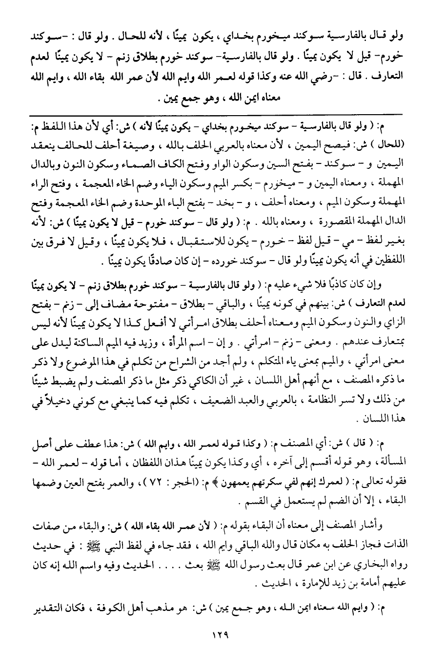 ولو قال بالفارسية سوكند ميخورم بخداي، يكون يمينا، لأنه للحال. ولو قال: سوكند خورم - قيل لا يكون يمينا. ولو قال بالفارسية - سوكند خورم بطلاق زنم - لا يكون يمينا لعدم التعارف. قال: - رَضِيَ اللَّهُ عَنْهُ - وكذا قوله لعمر الله وايم الله لأن عمر الله بقاء الله، وايم الله معناه ايمن الله، وهو جمع يمين.