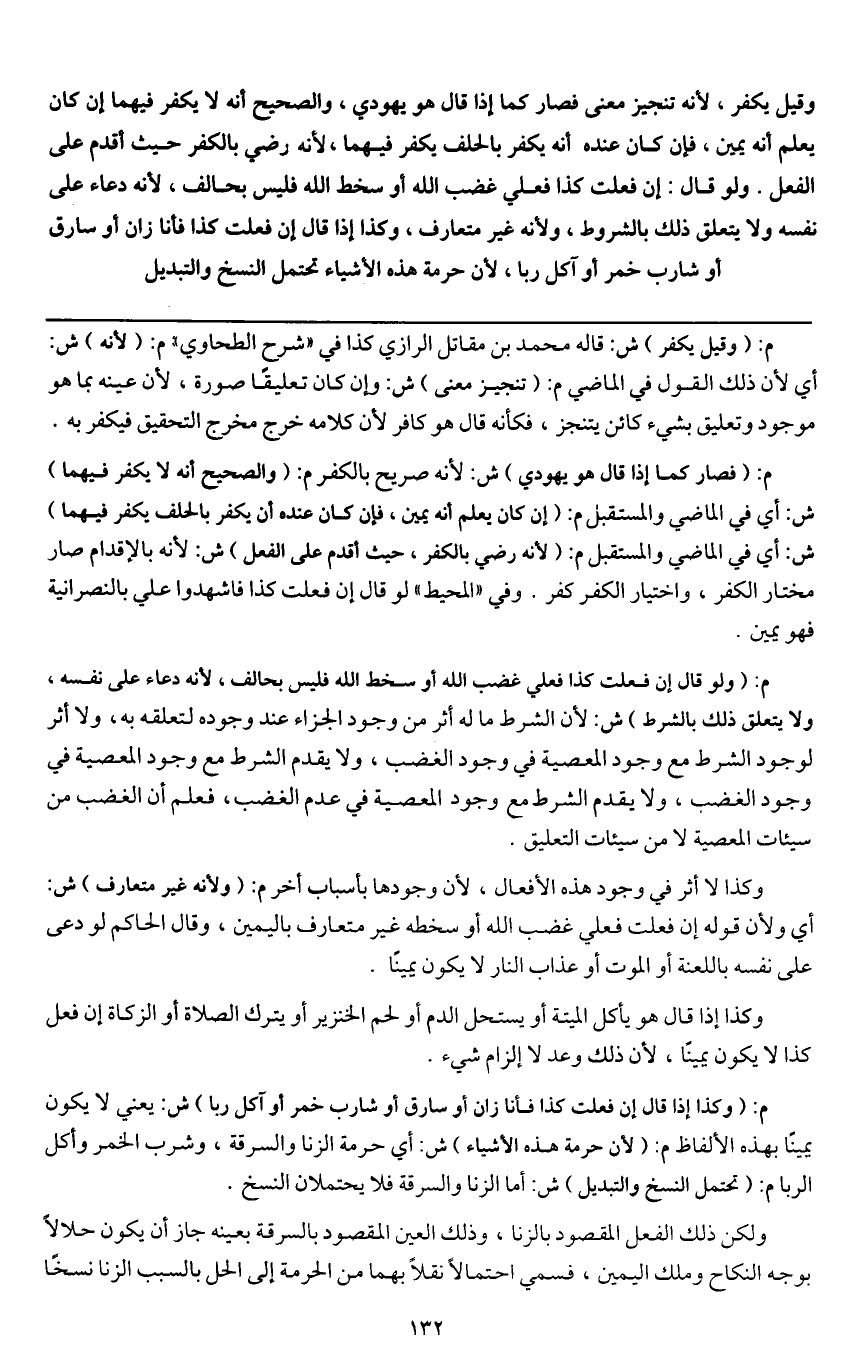 م: (وكذا إذا قال إن فعلت كذا فأنا زان أو سارق أو شارب خمر أو آكل ربا) ش: يعني لا يكون يمينًا بهذه الألفاظ م: (لأن حرمة هذه الأشياء) ش: أي حرمة الزنا والسرقة، وشرب الخمر وأكل الربا م: (تحتمل النسخ والتبديل) ش: أما الزنا والسرقة فلا يحتملان النسخ.