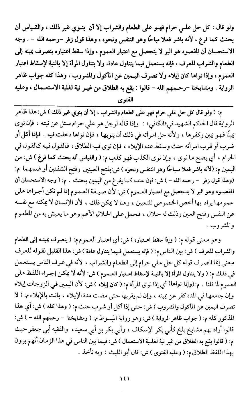 وهو معنى قوله م: (وإذا سقط اعتباره) ش: أي اعتبار العموم م: (ينصرف يمينه إلى الطعام والشراب للعرف) ش: بين الناس م: (فإنه يستعمل فيما يتناول عادة) ش: هذا القليل لقوله للعرف معنى إنما انصرف قوله كل حل علي حرام إلى الطعام والشراب، لأنه في عرف الناس يستعمل في ذلك م: (ولا يتناول المرأة إلا بالنية لإسقاط اعتبار العموم) ش: لأنه لا يمكن إجراء اللفظ على العموم لما قلنا. م: (وإذا نواها) ش: أي إذا نوى المرأة م: (كان إيلاء) ش: لأن اليمين في الزوجات إيلاء وإن جامعها في المدة كفر عن يمينه، وإن لم يقربها حتى مضت مدة الإيلاء، بانت بالإيلاء م: (لا تصرف اليمين عن المأكول والمشروب) ش: حتى إذا أكل أو شرب حنث م: (وهذا كله) ش: أي هذا المذكور كله م: (جواب ظاهر الرواية) ش: وهو رواية المبسوط م: (ومشايخنا - رَحِمَهُمُ اللَّهُ -) ش: قالوا أراد بهم مشايخ بلخ كأبي بكر الإسكاف، وأبي بكر بن أبي سعيد، والفقيه أبي جعفر حيث م: (قالوا يقع به الطلاق من غير نية لغلبة الاستعمال) ش: فيما بين الناس في هذا الزمان أنهم يرون بهذا اللفظ الطلاق م: (وعليه الفتوى) ش: قال أبو الليث: وبه نأخذ.