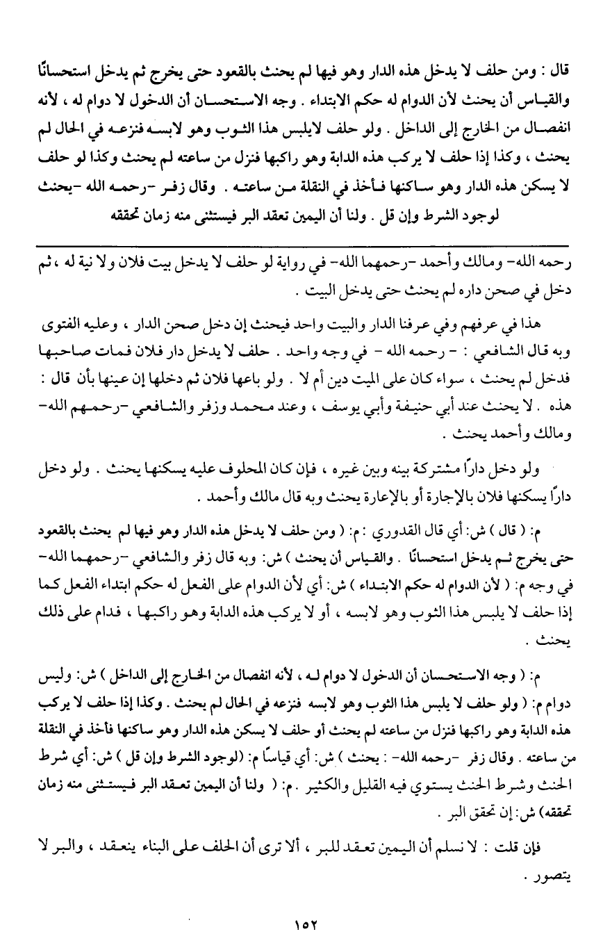 قال: ومن حلف لا يدخل هذه الدار وهو فيها لم يحنث بالقعود حتى يخرج ثم يدخل استحسانا والقياس أن يحنث لأن الدوام له حكم الابتداء. وجه الاستحسان أن الدخول لا دوام له، لأنه انفصال من الخارج إلى الداخل. ولو حلف لا يلبس هذا الثوب وهو لابسه فنزعه في الحال لم يحنث، وكذا إذا حلف لا يركب هذه الدابة وهو راكبها فنزل من ساعته لم يحنث وكذا لو حلف لا يسكن هذه الدار وهو ساكنها فأخذ في النقلة من ساعته. وقال زفر - رَحِمَهُ اللَّهُ - يحنث لوجود الشرط وإن قل. ولنا أن اليمين تعقد البر فيستثنى منه زمان تحققه