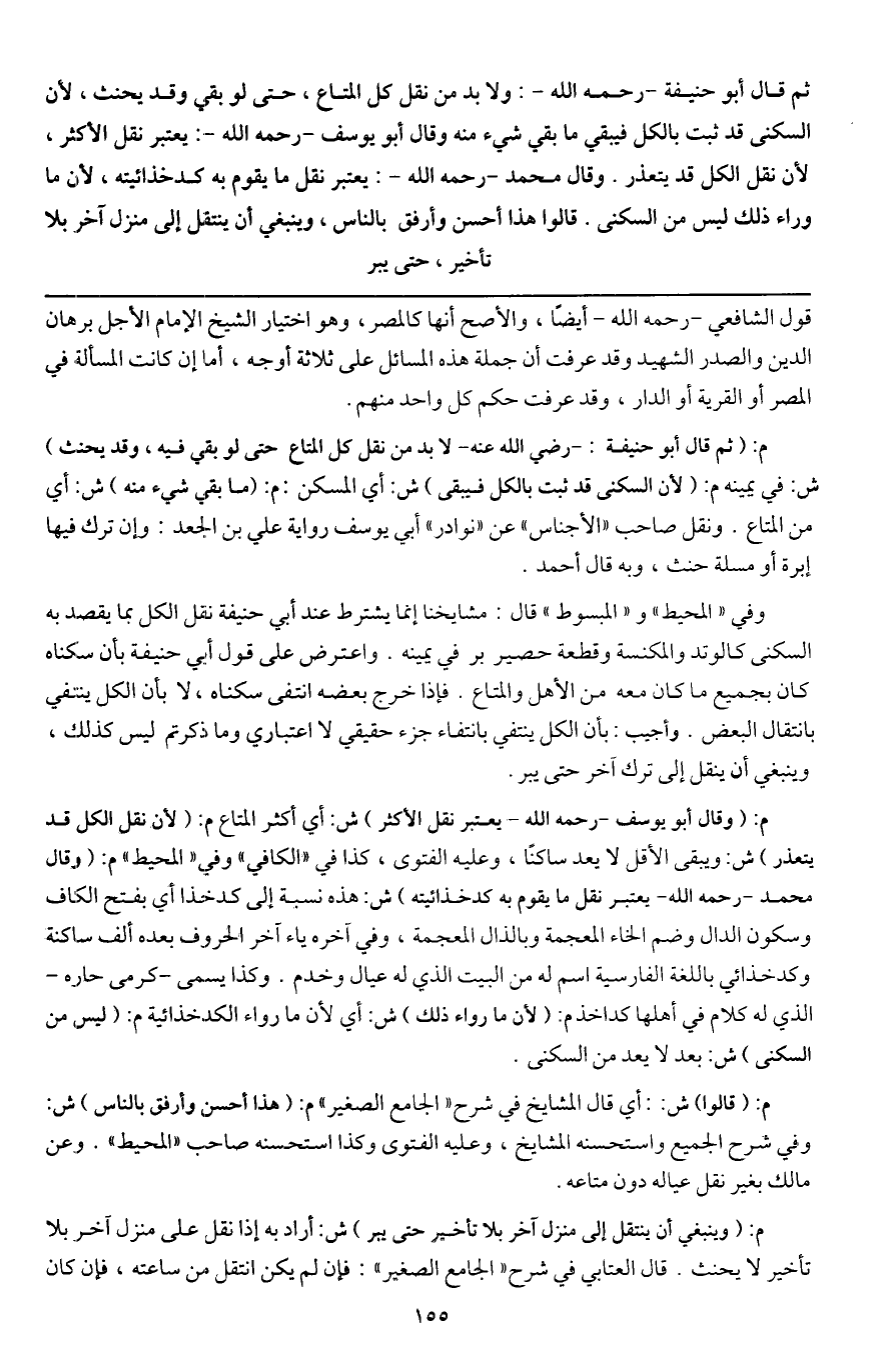 ثم قال أبو حنيفة: - رَضِيَ اللَّهُ عَنْهُ - ولا بد من نقل كل المتاع حتى لو بقي فيه، وقد يحنث لأن السكنى قد ثبت بالكل فيبقى ما بقي شيء منه وقال أبو يوسف - رَحِمَهُ اللَّهُ - يعتبر نقل الأكثر لأن نقل الكل قد يتعذر وقال محمد - رَحِمَهُ اللَّهُ - يعتبر نقل ما يقوم به كدخذائيته لأن ما رواء ذلك ليس من السكنى قالوا هذا أحسن وأرفق بالناس