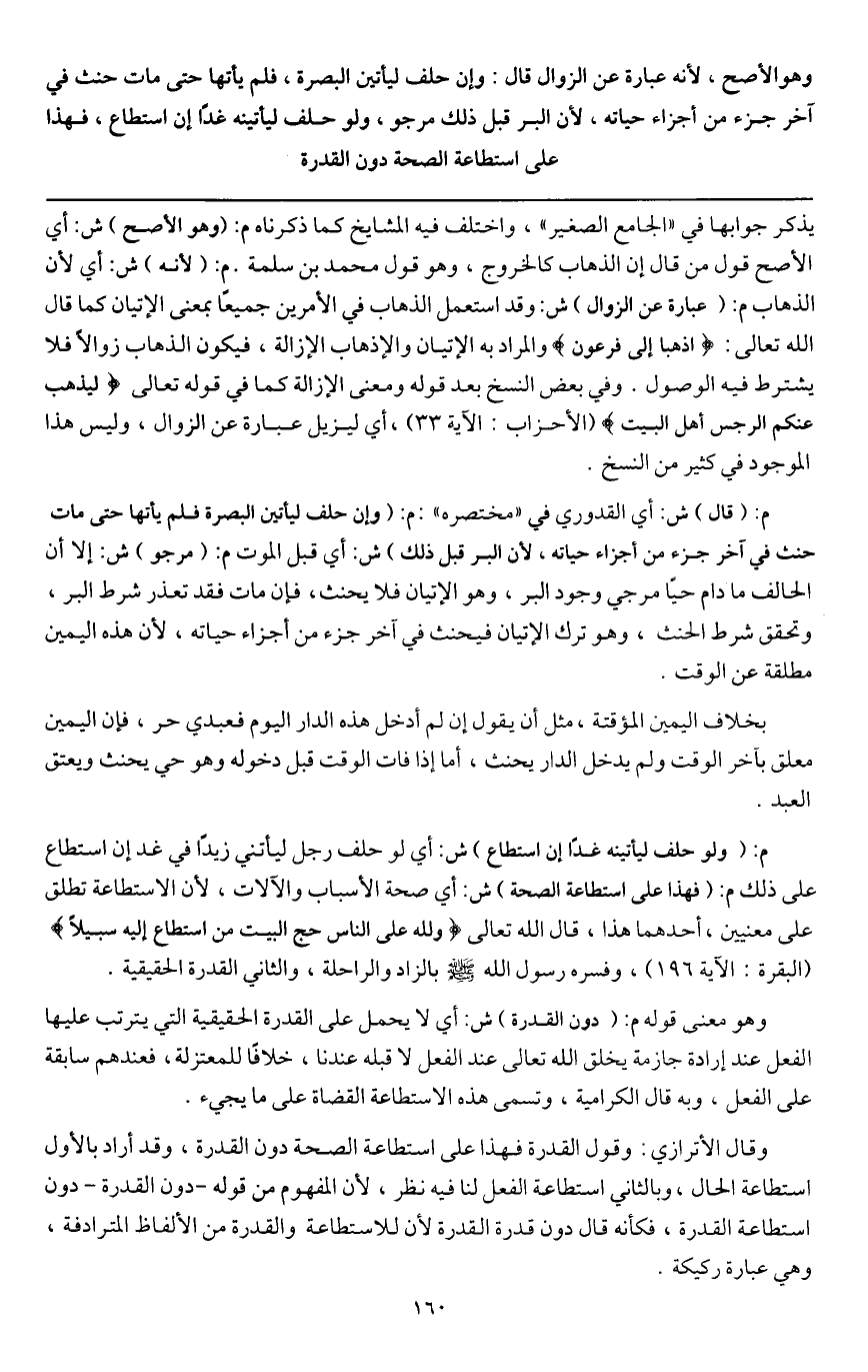 وقال الأترازي: وقول القدرة فهذا على استطاعة الصحة دون القدرة، وقد أراد بالأول استطاعة الحال، وبالثاني استطاعة الفعل لنا فيه نظر، لأن المفهوم من قوله دون القدرة دون استطاعة القدرة، فكأنه قال دون قدرة القدرة لأن للاستطاعة والقدرة من الألفاظ المترادفة، وهي عبارة ركيكة.