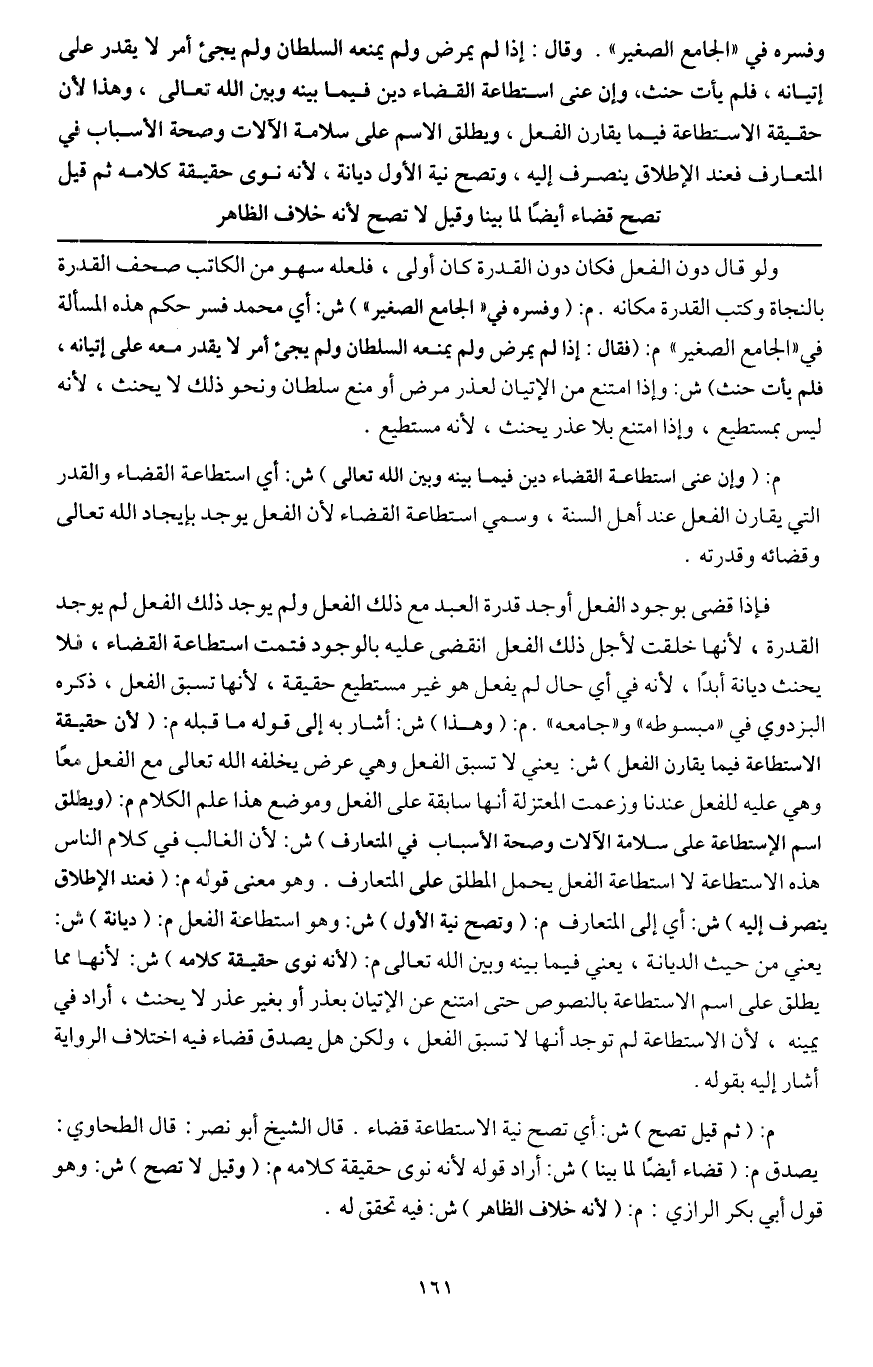 م: (وإن عنى استطاعة القضاء دين فيما بينه وبين الله تعالى) ش: أي استطاعة القضاء والقدر التي يقارن الفعل عند أهل السنة، وسمي استطاعة القضاء لأن الفعل يوجد بإيجاد الله تعالى وقضائه وقدرته.